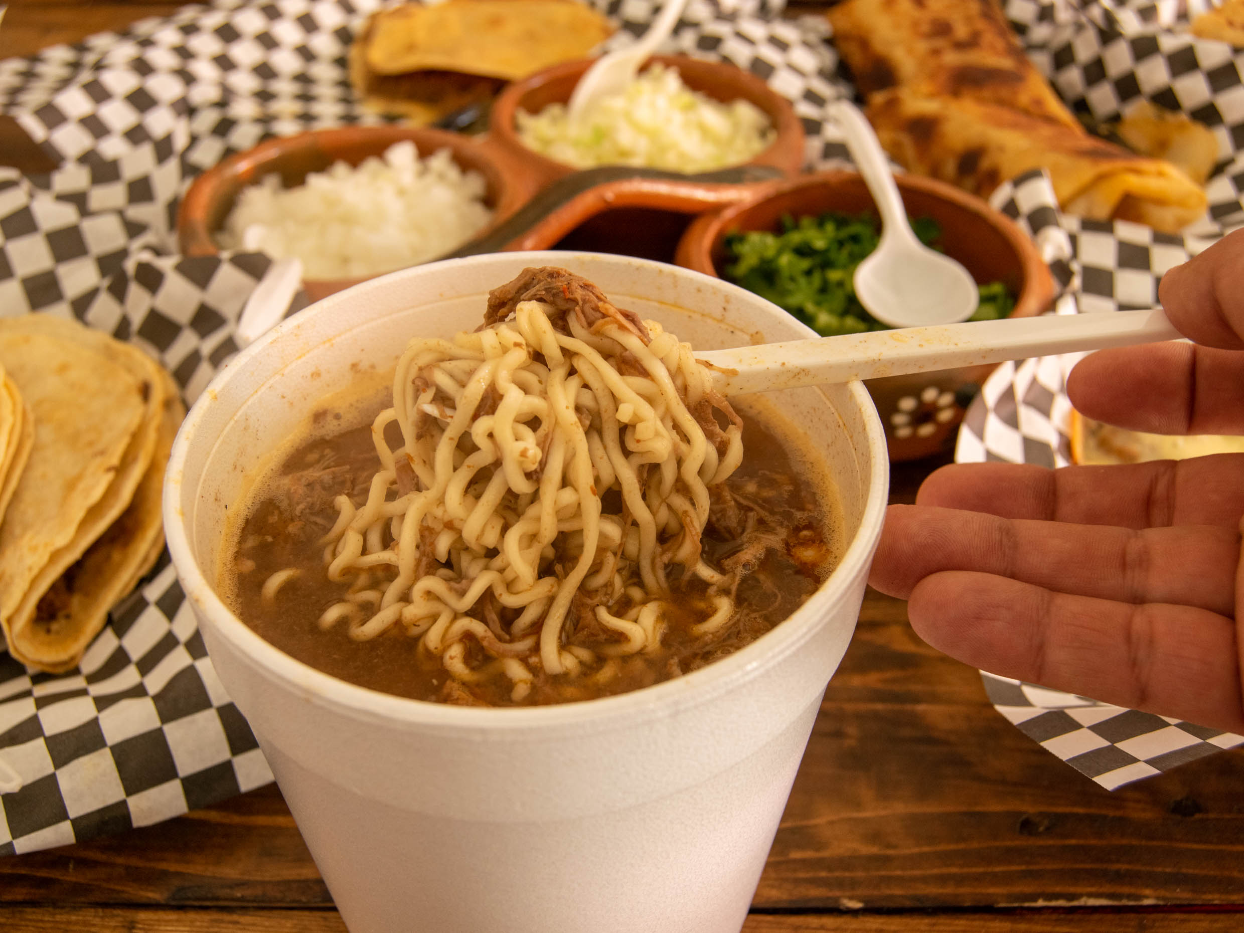 Ramen de birria de res acompañados de consome, salsa de la casa, cebolla, repollo, limones, cilantro, ademas de chile, cebolla asada.