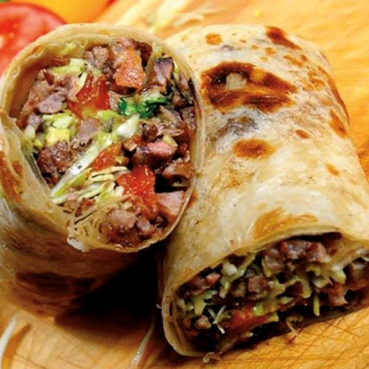 Tortilla Burrera, Queso gratinado, Birria de Res, acompañada de Cilantro, Cebolla, Repollo, salsa roja y limones