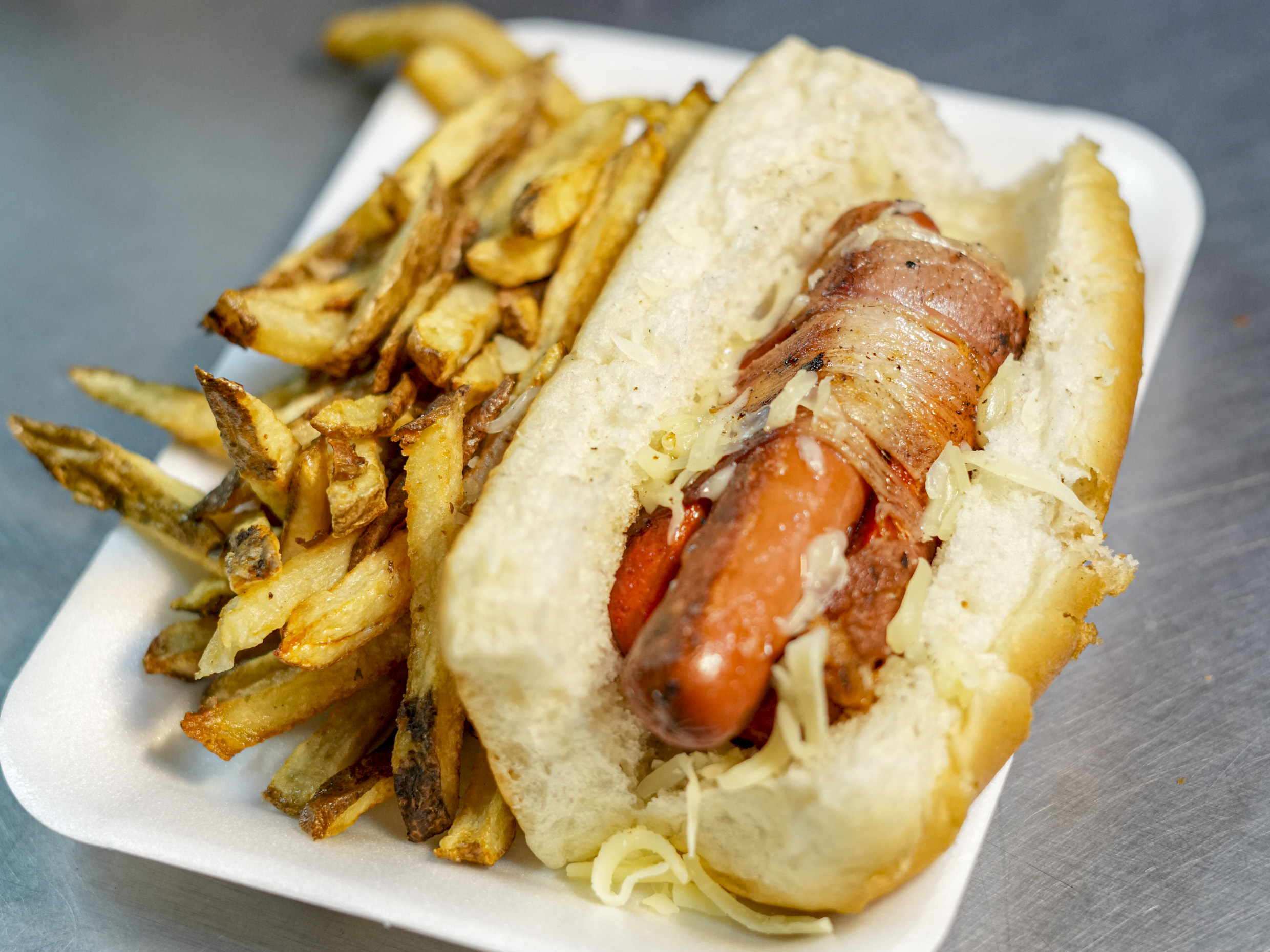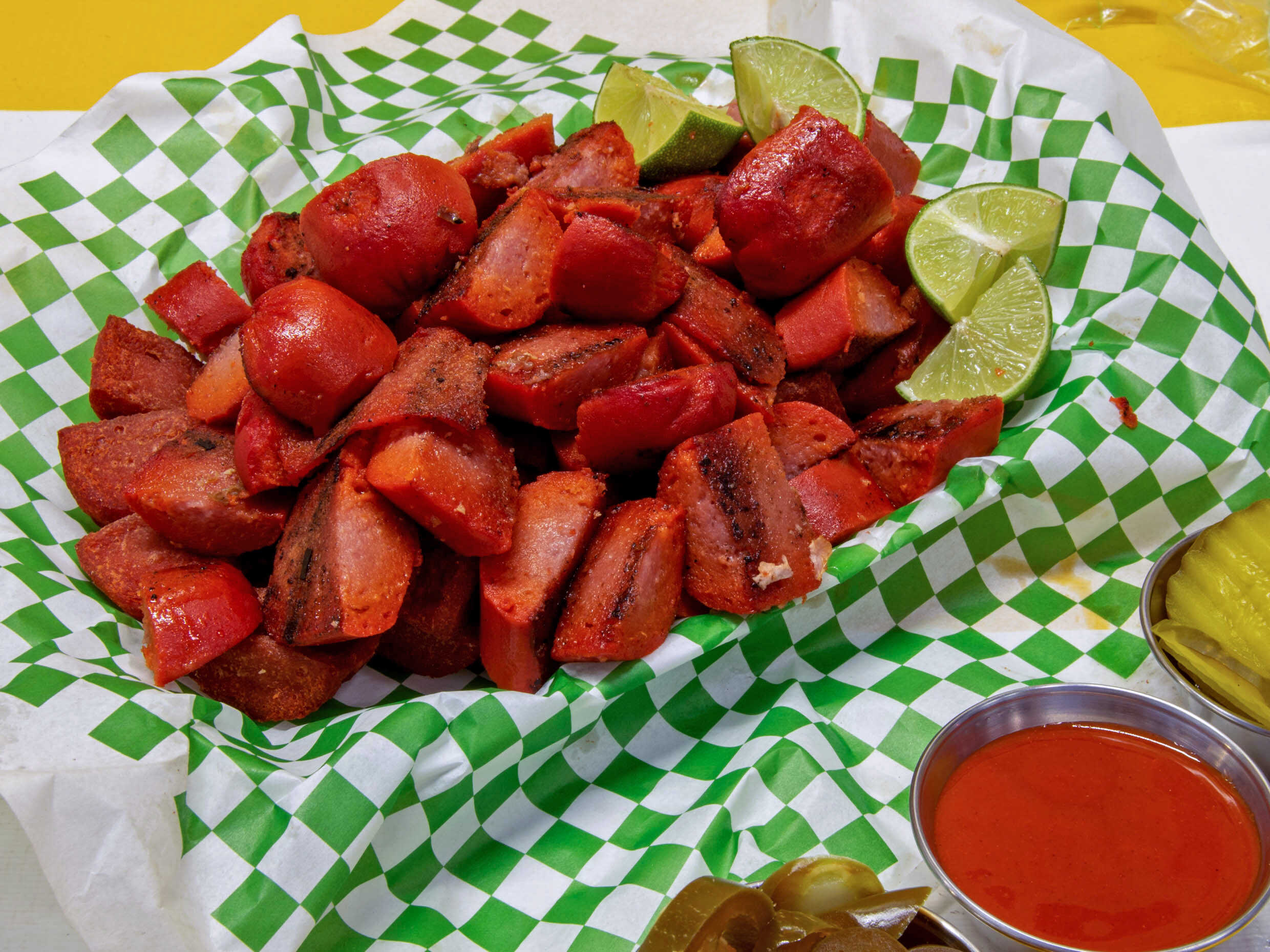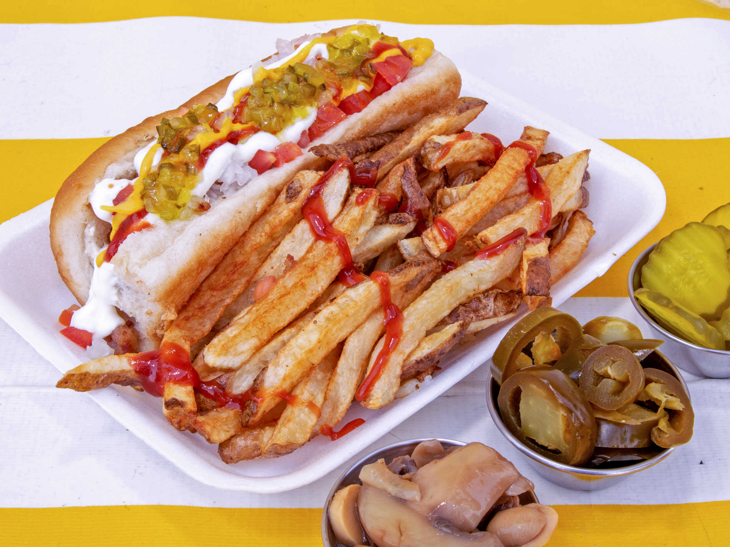 pan de panaderia con salchicha de pavo tocino aderezo chipotle mayonesa mostaza catsup tomate cebolla chile jalapeño molido,pepinillo.