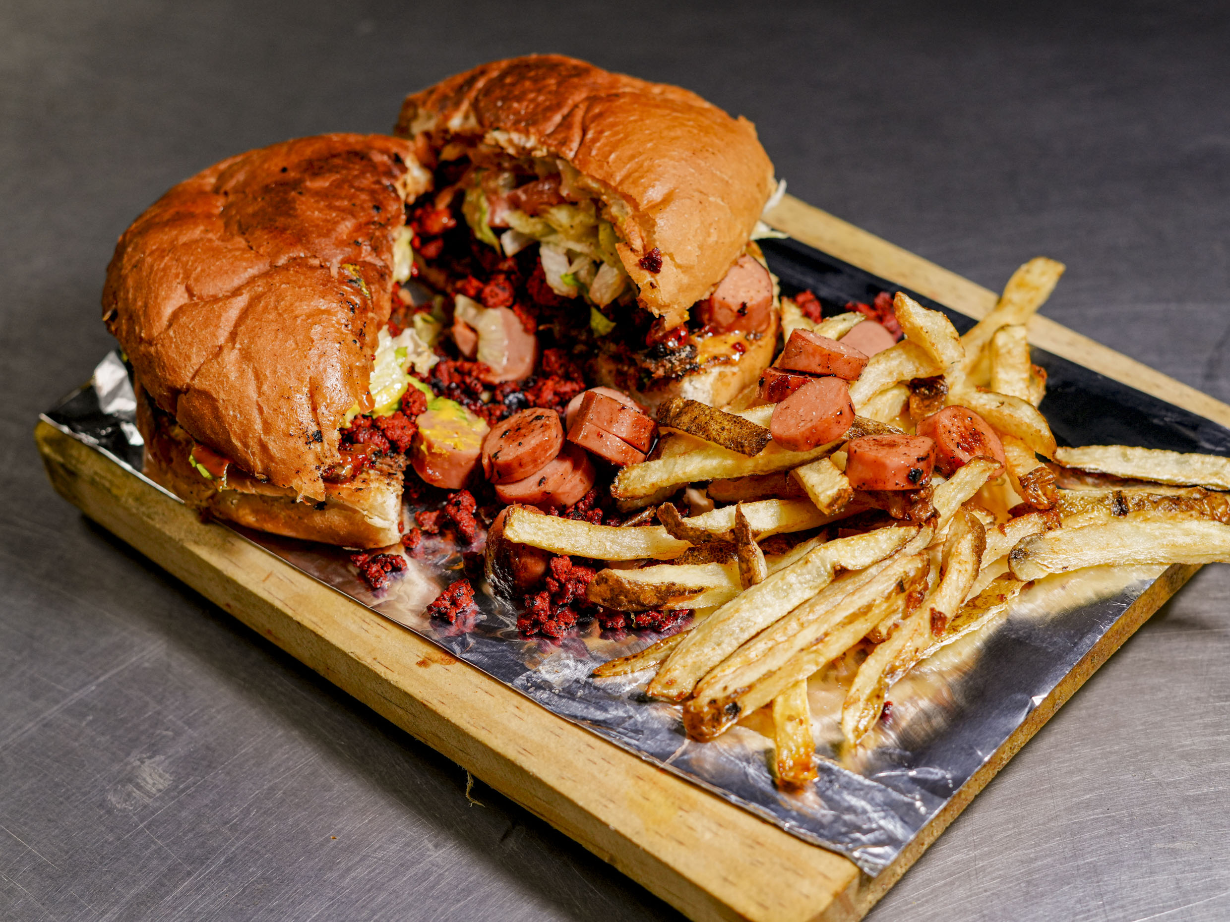 Hamburguesa con pan grande de panaderia carne 100% natural hecha al carbon queso sonora Jamon chorizo chiles en rajas aderezo chipotle salchicha lechuga tomate cebolla mayonesa mostaza catsup acompañada con papas
