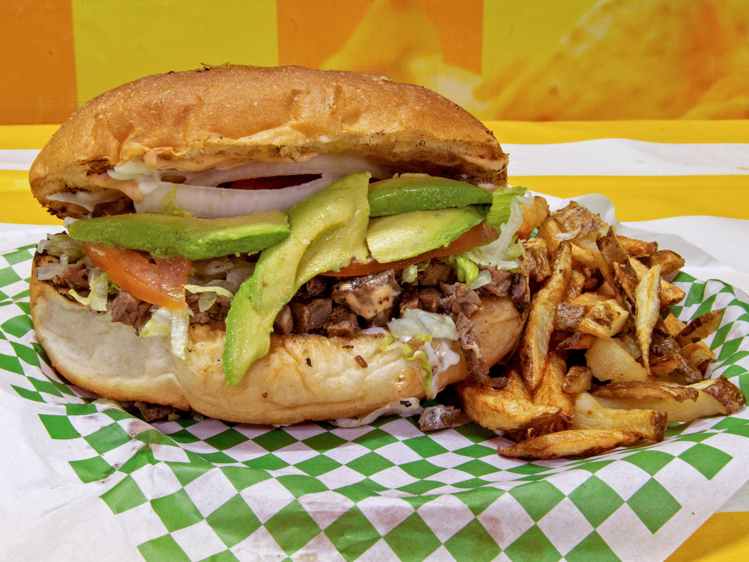 Torta que cuenta con pan grande de panaderia con carne asada 100% de res asada al carbon lechuga tomate cebolla aguacate aderezo queso sonora y chile habanero ranch mayonesa acompañado con papas