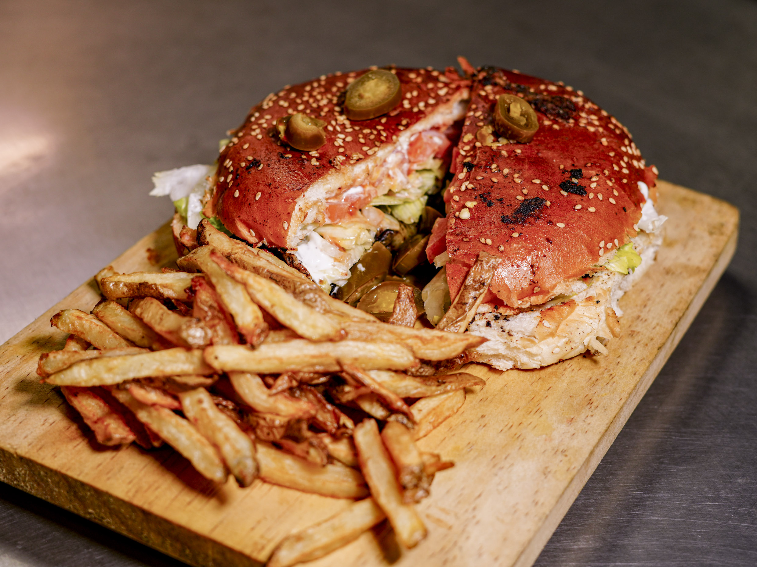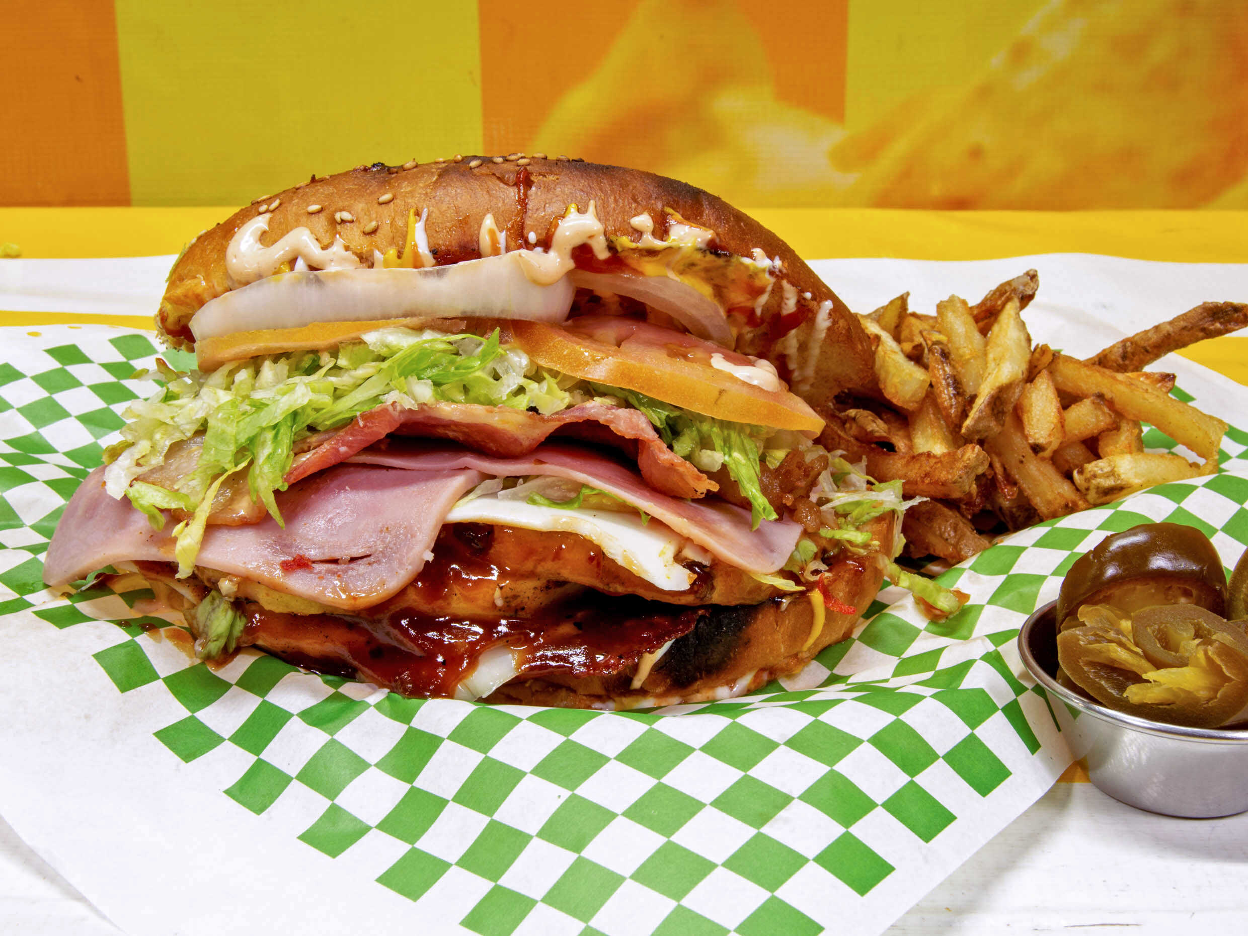 pan grande de panaderia con carne 100% de res receta de la casa y al carbon con aderezo chipotle mayonesa mostaza catsup lechuga tomate cebolla tocino pepinillo entero jalapeño rodajas queso amarillo acompañada con papas