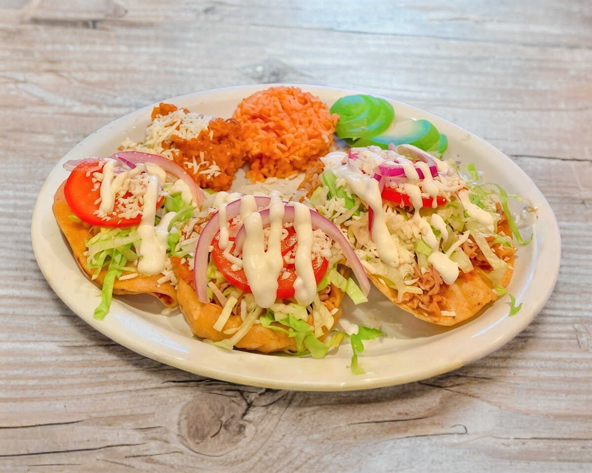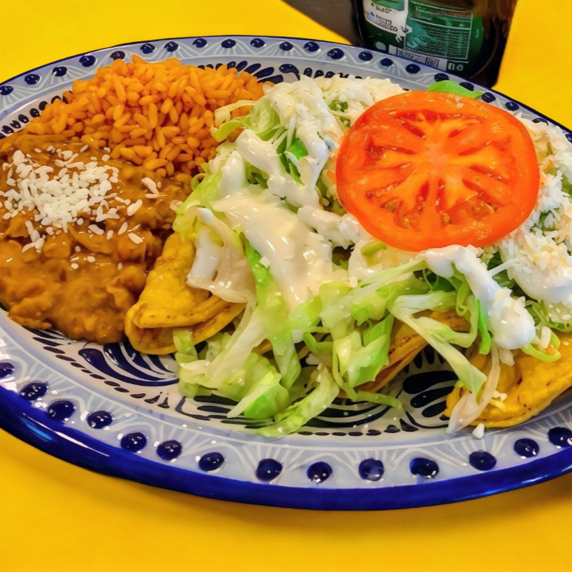 3 Piezas servidas con lechuga, queso, crema, acompañadas de frijoles y arroz.