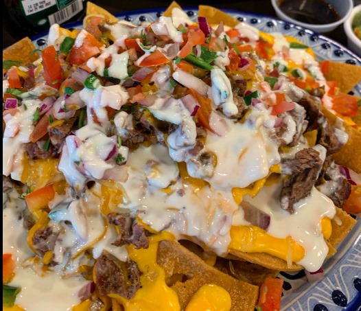 Con queso, arrachera asada, salsa bandera, crema y guacamole.