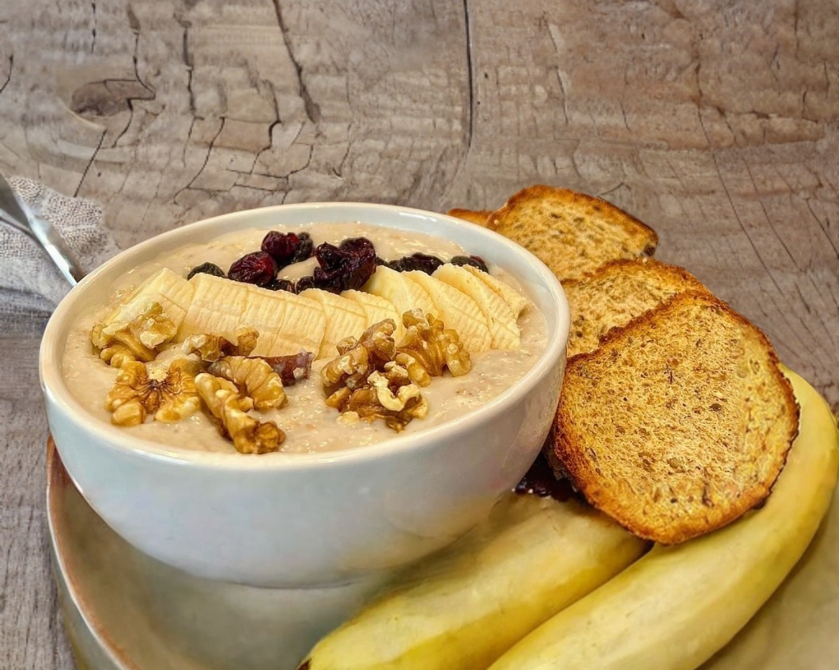 Hojuelas de avena, acompañadas de nuez, plátano, arándanos, pídela líquida o espesa.