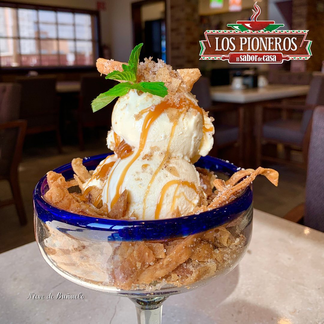 Delicioso y crujiente waffle cubierto con salsa de frutos rojos y una cremosa bola de nieve.