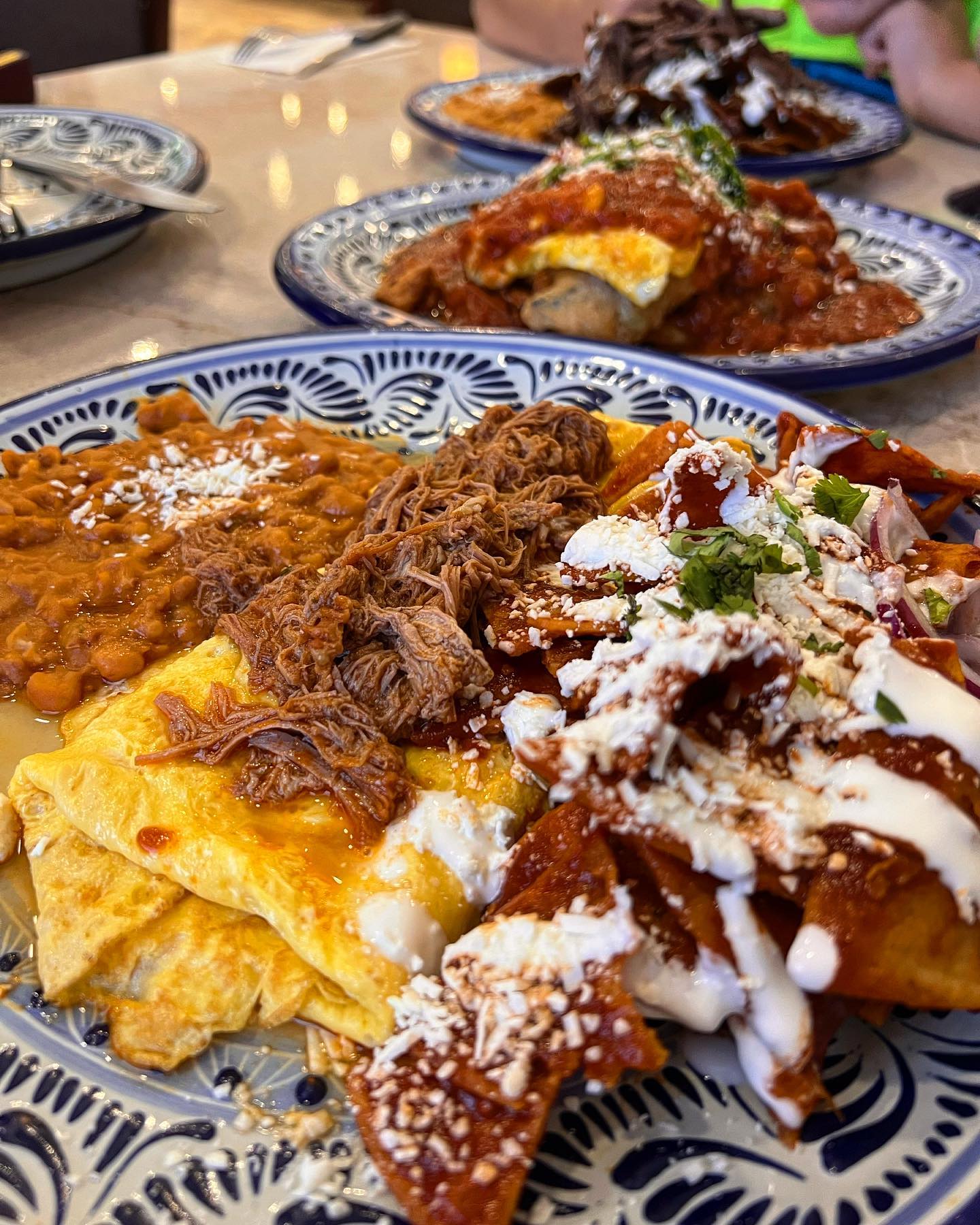 Omelette con un guisado, acompañado de frijoles refritos y chilaquiles.