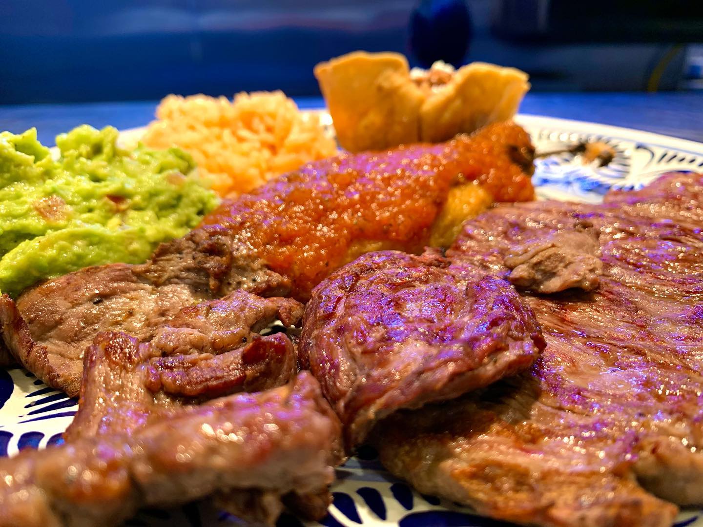 450 Gramos de proteína, con pimiento y cebollas asadas, acompañadas de frijoles refritos, guacamole y arroz.