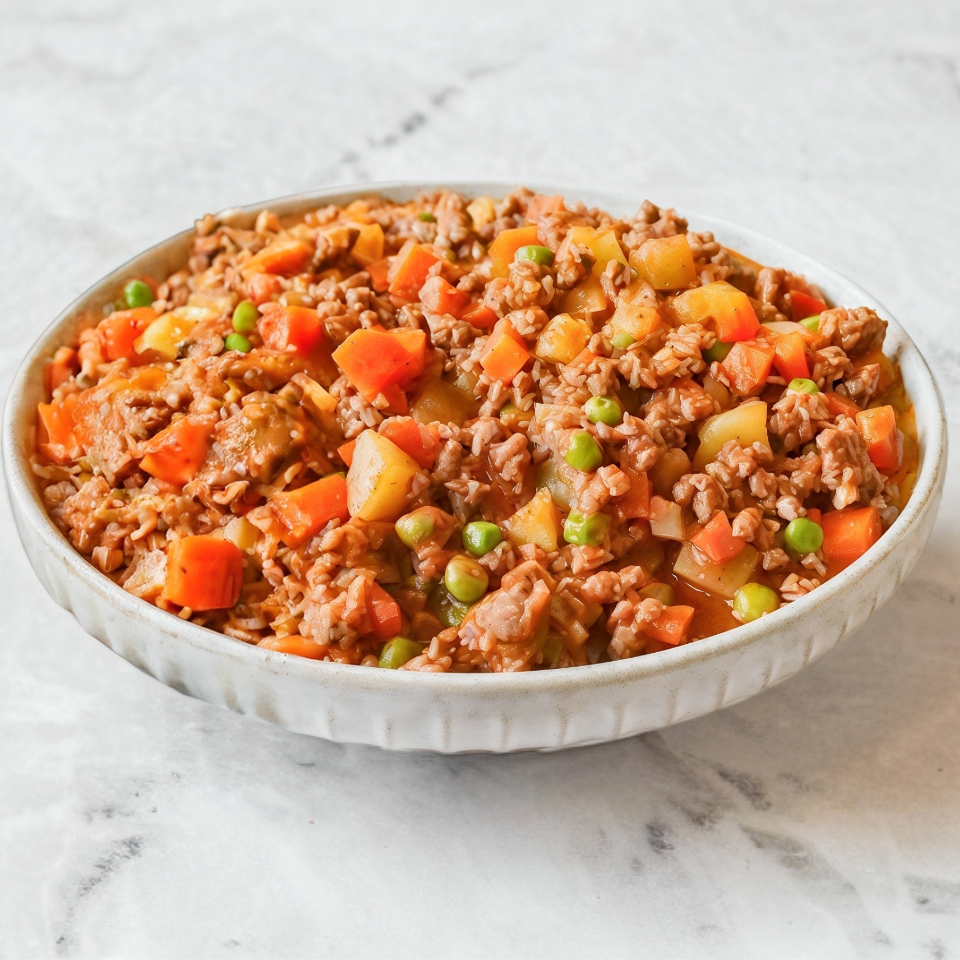 Jugosa carne molida con verduras en trozos