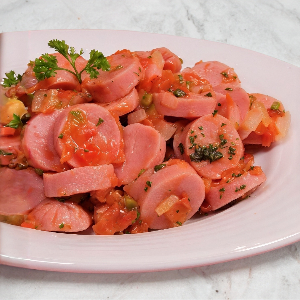 Rica salchicha con verdura y salsa de tomate