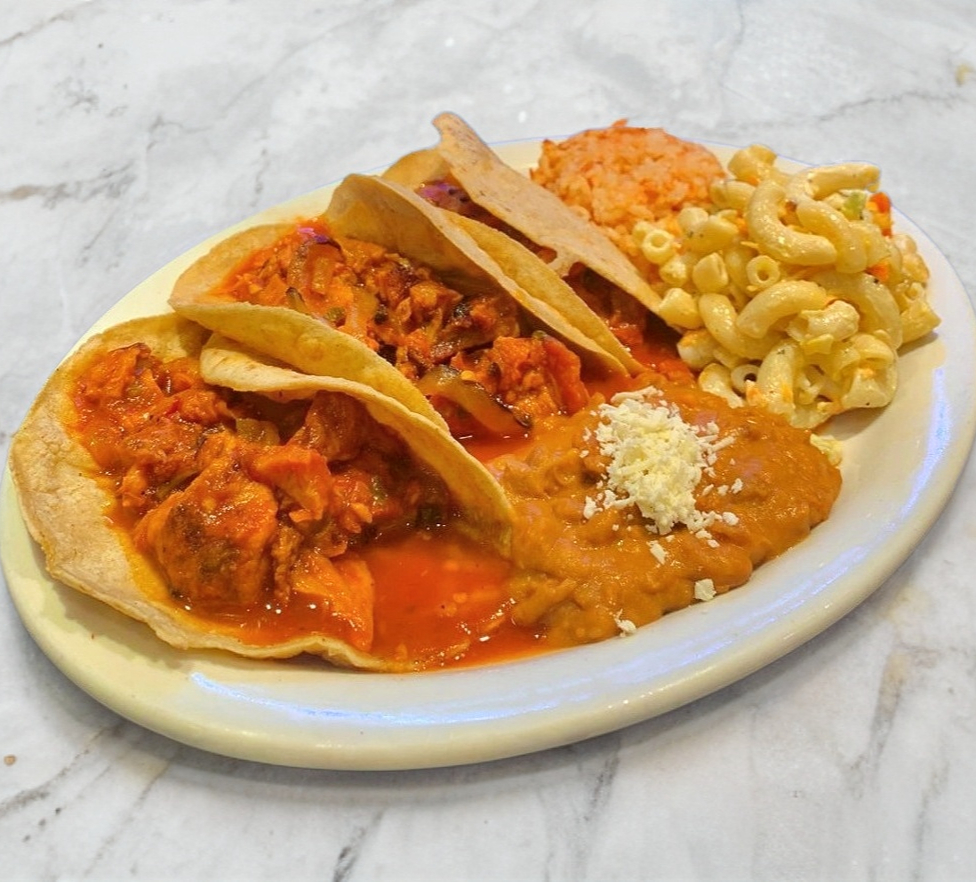 Incluye 3 tacos, frijoles refritos y ensalada fría.