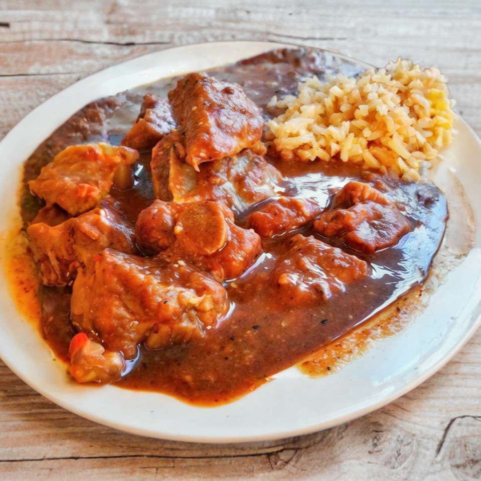 Costillitas de puerco en salsa tatemada, acompañadas de arroz y frijol