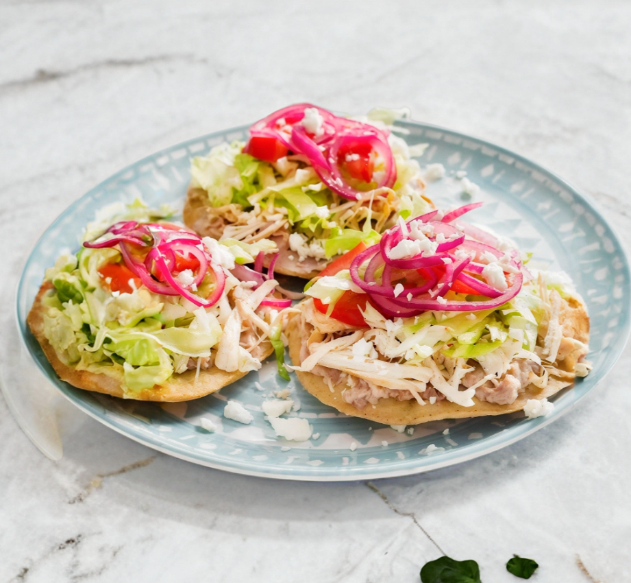 Orden de 3 tostadas de res o pollo, acompañadas con salsa de tomate