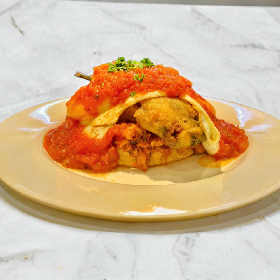 Crujiente sope con base de frijoles refritos, un guisado o dos al gusto y queso. Acompañados de chile relleno y huevos estrellados.