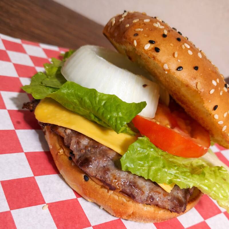 carne 100 % de res, queso , verduras y aderezos acompañada de papas