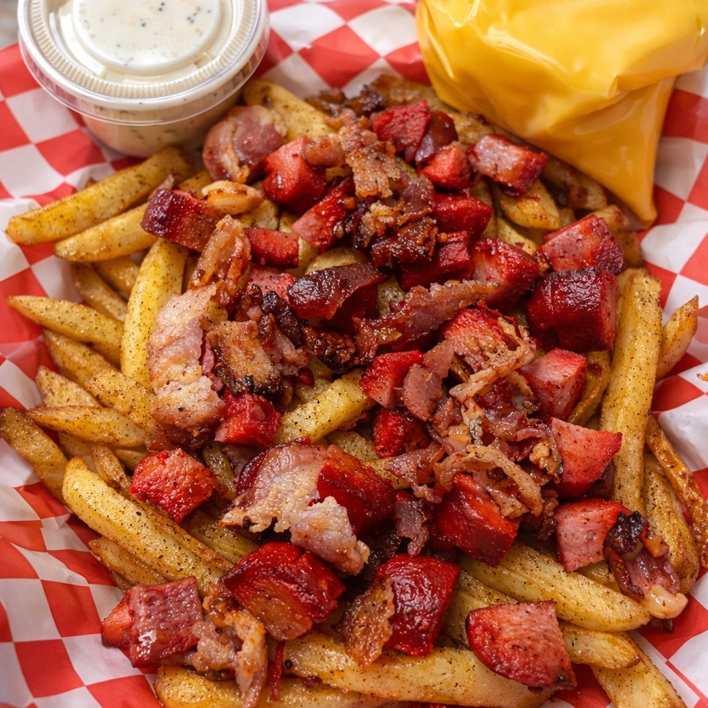 papas con queso amarillo , tocino y bubba.