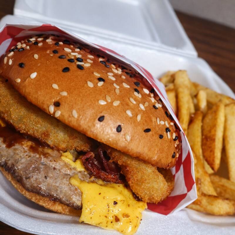 carne 100% de res, queso, aros de cebolla , salsa bbq y tocino acompañado de papas