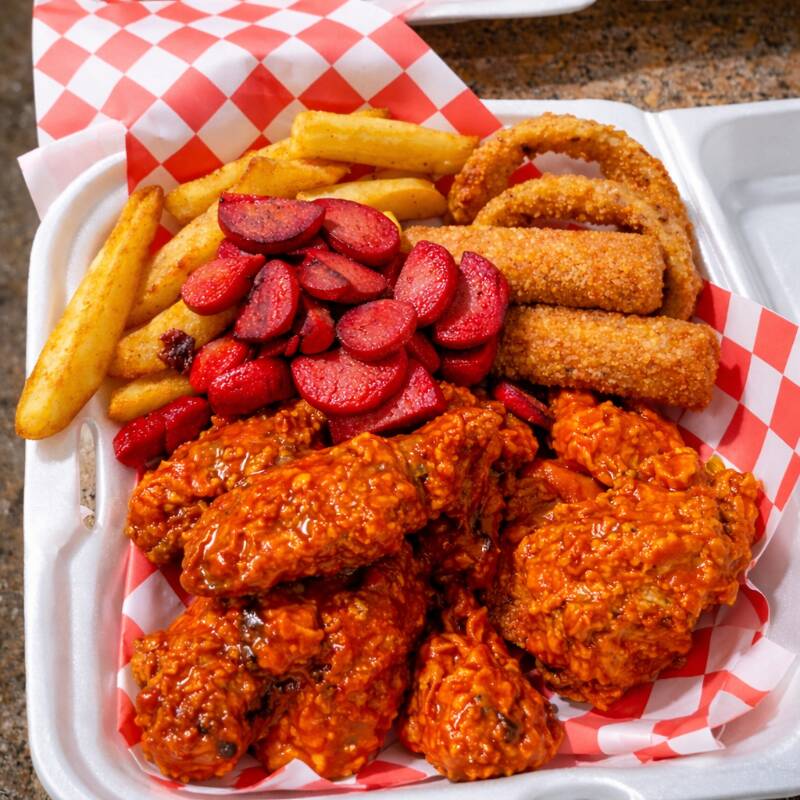 Boneless , alitas, bubas, dedos de queso , aros de cebolla,papas