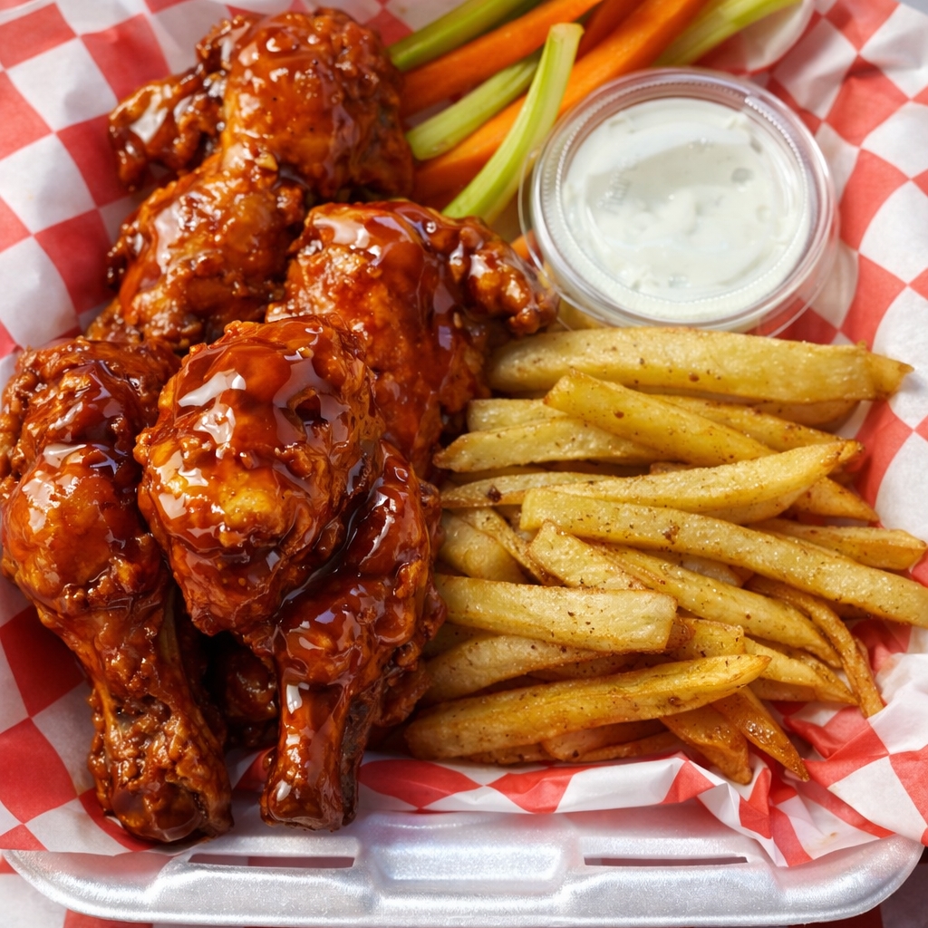 Alitas con tu salsa favorita acompañado de papas y aderezo.