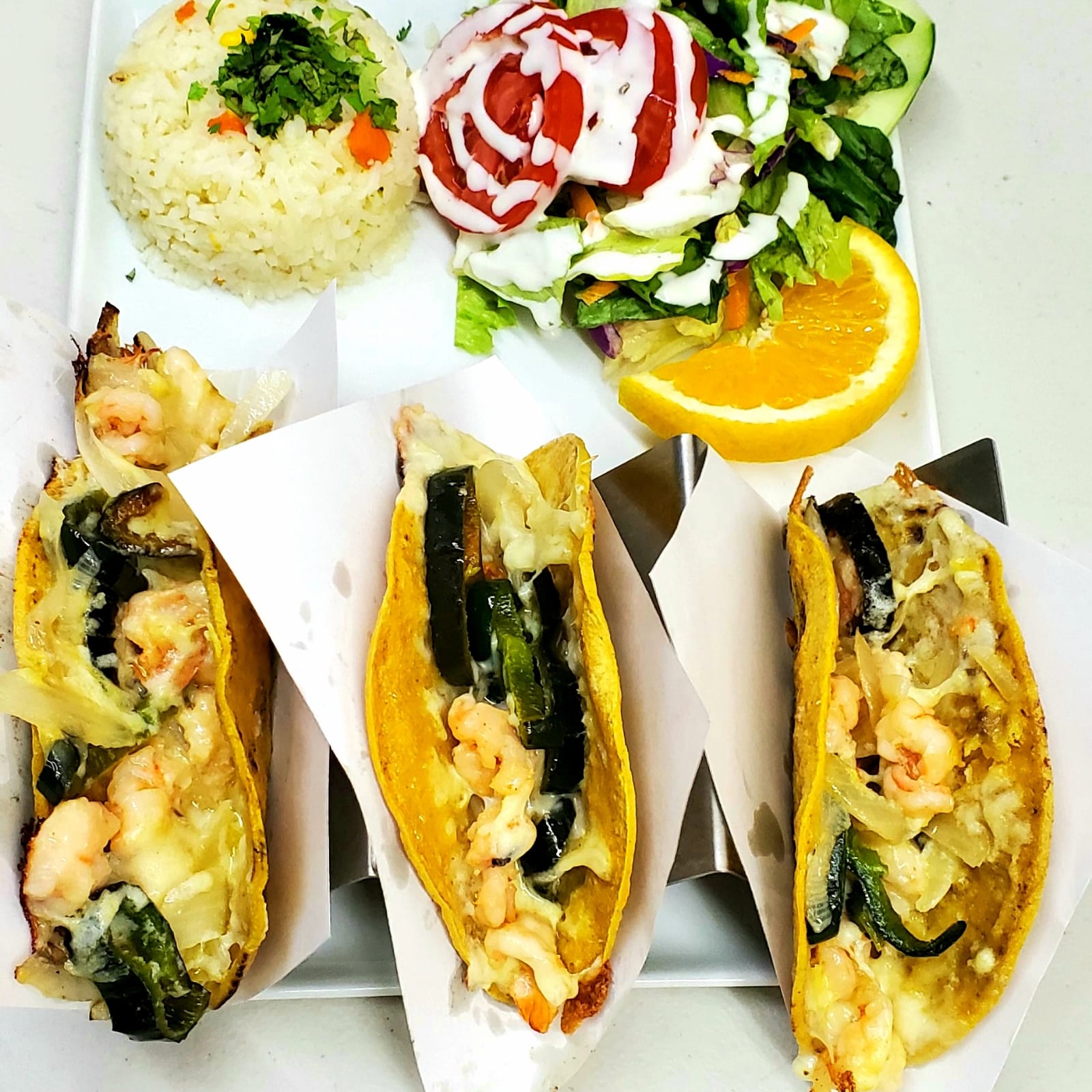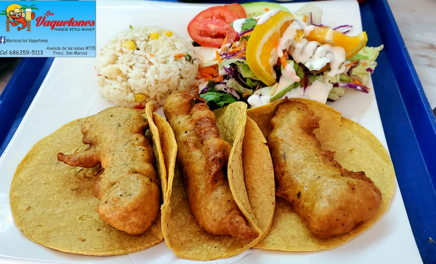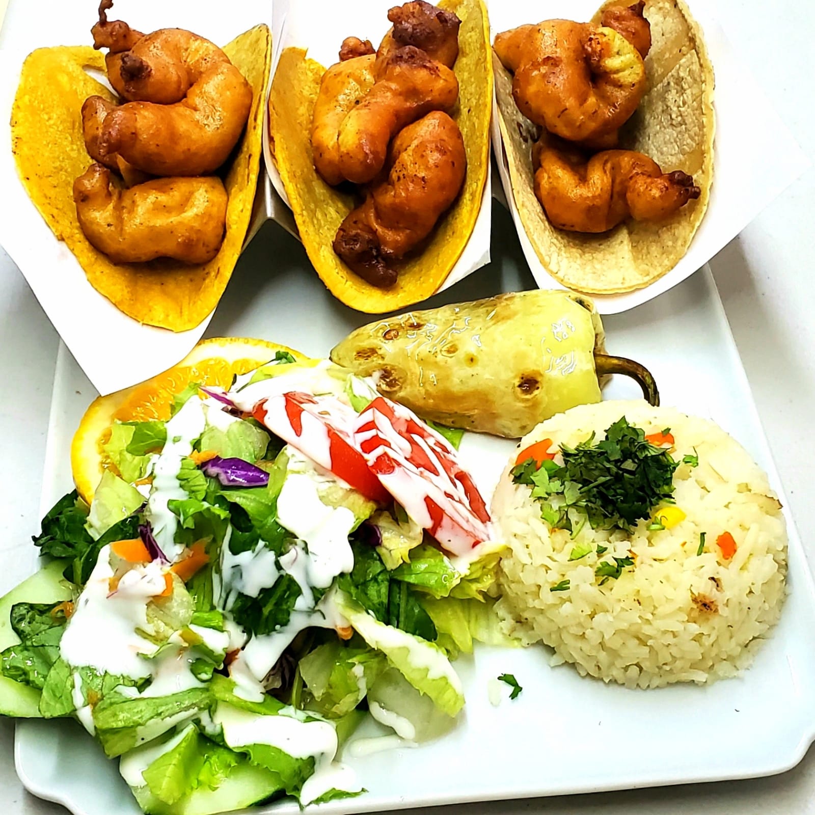 3 Tacos de camaron (2 o 3 camarones depende el tamaño) 1 porcion de arroz.