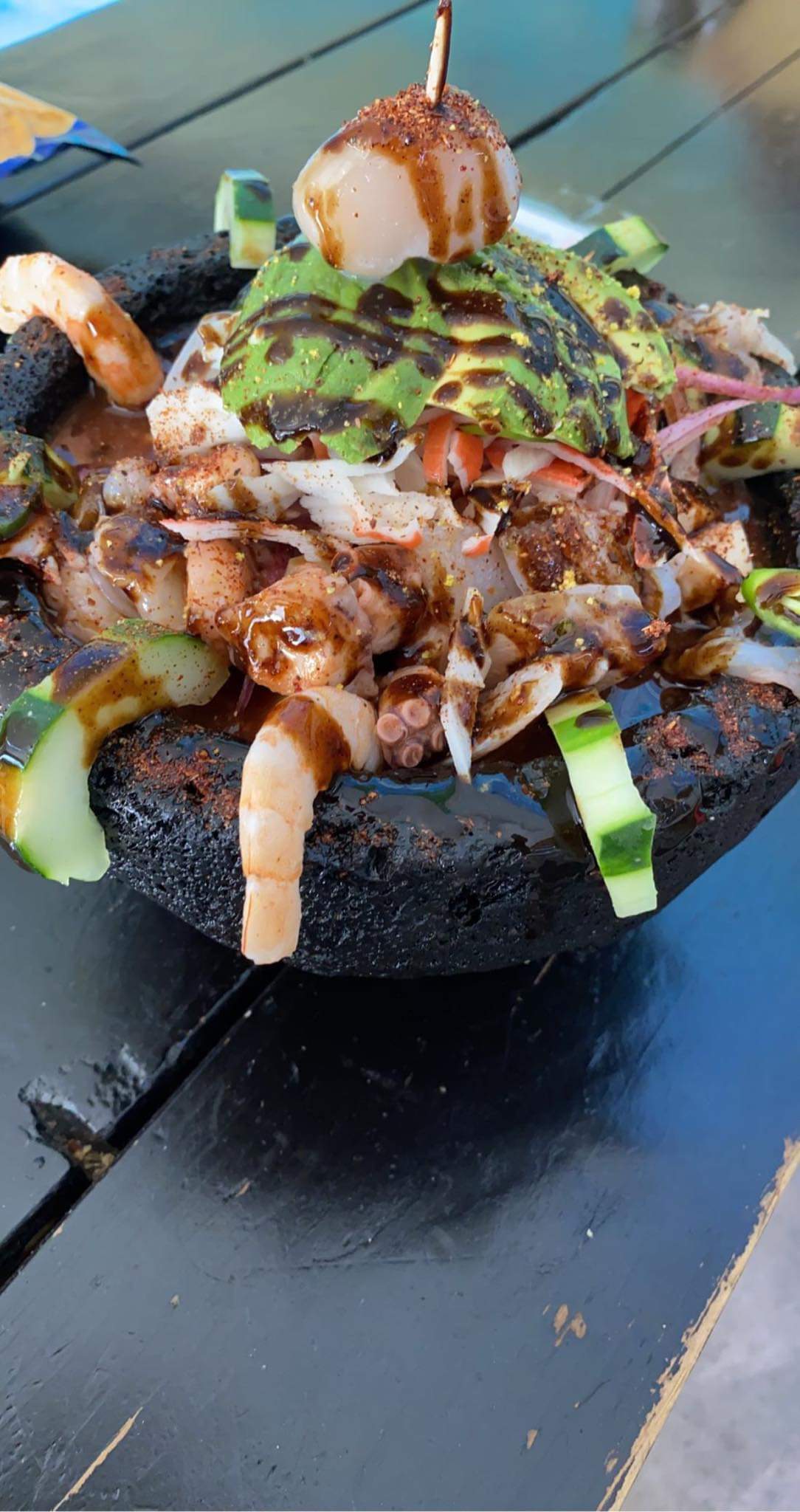 Tostada de camarón con pulpo.