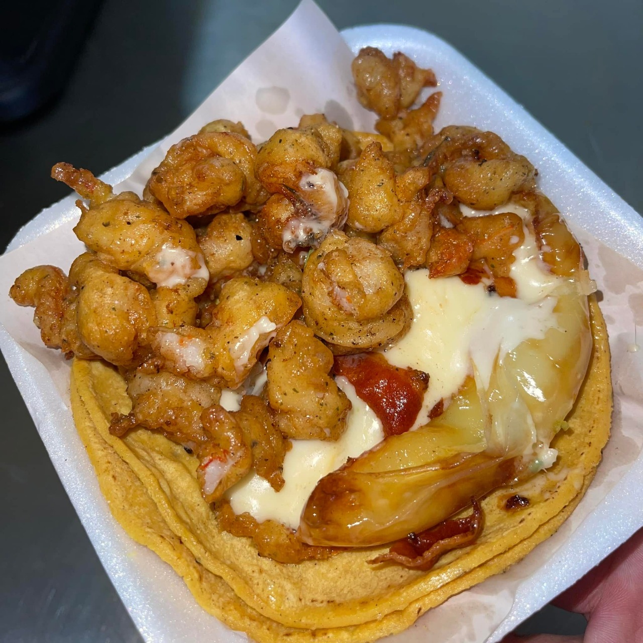 TACO DOBLE TORTILLA , CHILE GUERO,QUESO,ENROLLADO EN TOCINO Y CAMARON EMPANIZADO