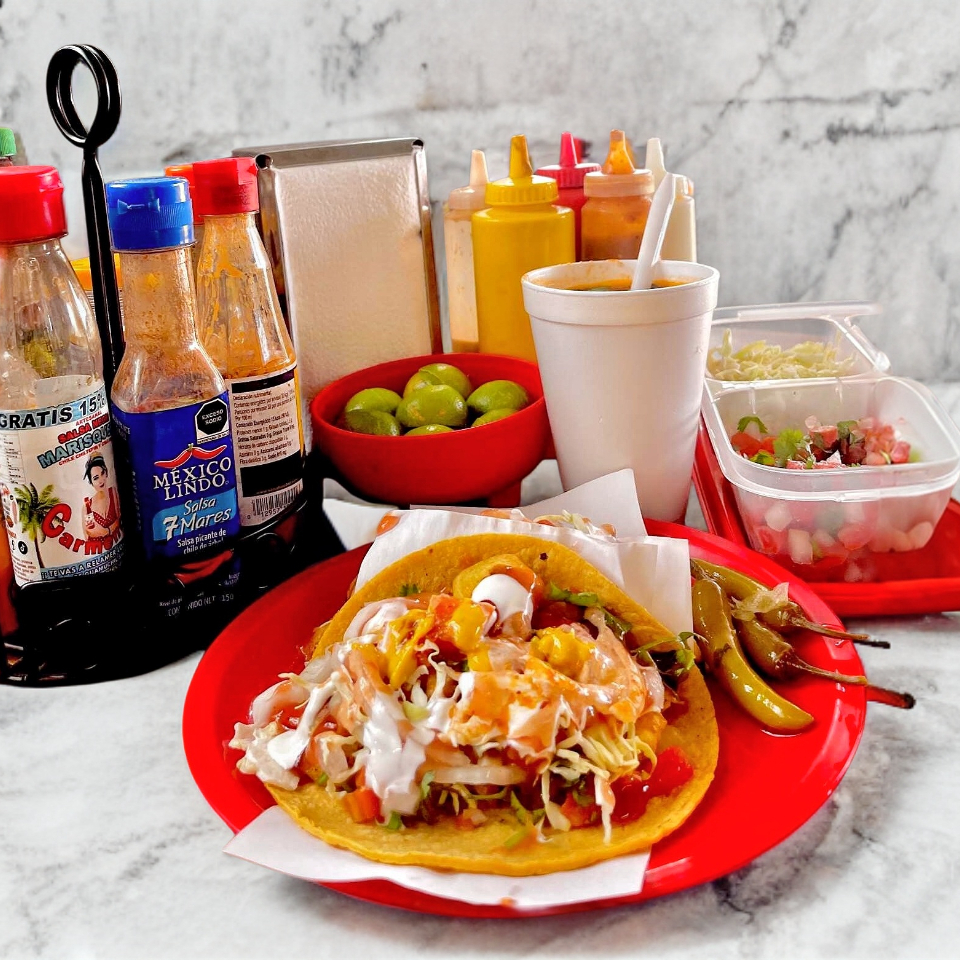 MANTARRAYA, CAMARON, SURIMI, REPOLLO, CEBOLLA Y CILANTRO, CEBOLLA CON HABANERO Y SALSA PICANTE A PARTE.