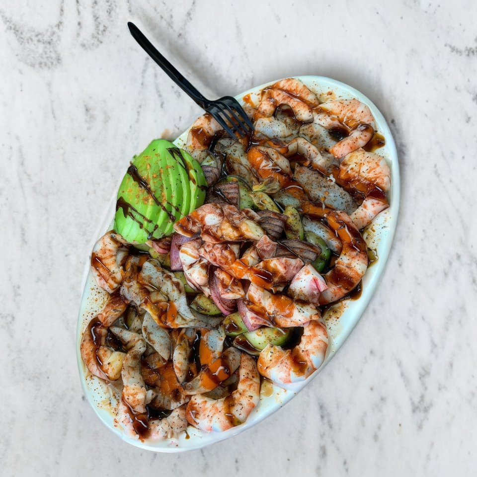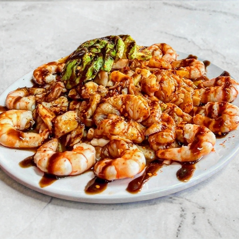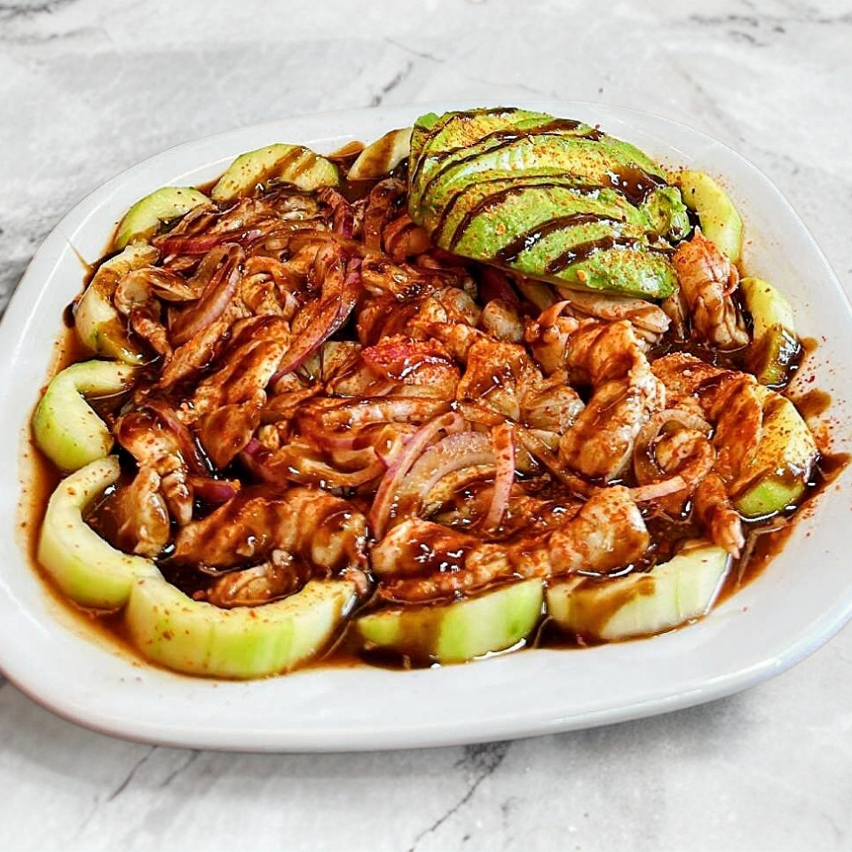 CAMARON COCIDO , CURTIDO , PULPO, PEPINO,CEBOLLA Y SALSA NEGRA DE LA CASA