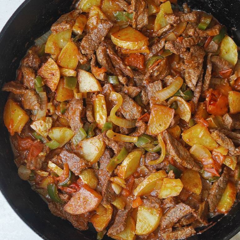 Carne de res mongol (salsa dulce-picosa) acompañada de pimiento verde, rojo y cebolla