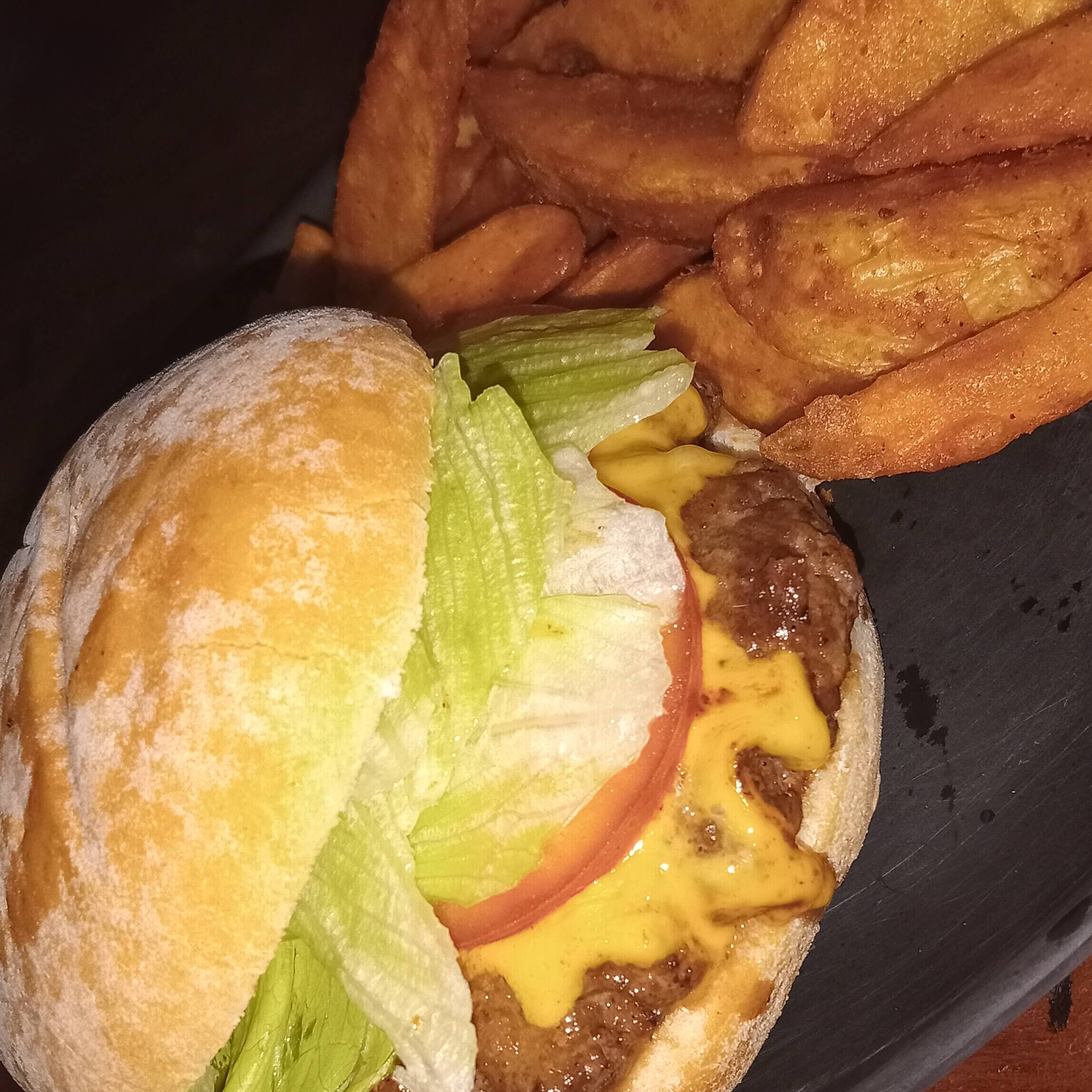 160Gr de carne de res, tomate, lechuga, cebolla, queso amarillo o blanco y aderezos (ketchup, mostaza y mayonesa) acompañada de una orden de papas fritas