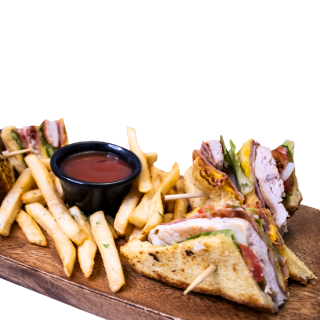 Pechuga de pollo a la plancha, jamón, tocino, queso americano, lechuga romana, tomate, en pan de barra tipo artesanal, con papas frita.