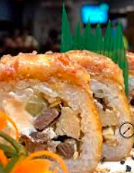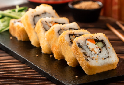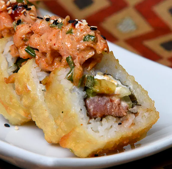 Camaron empanizado y aguacate por dentro, forrado de queso crema y topping de tampico.
