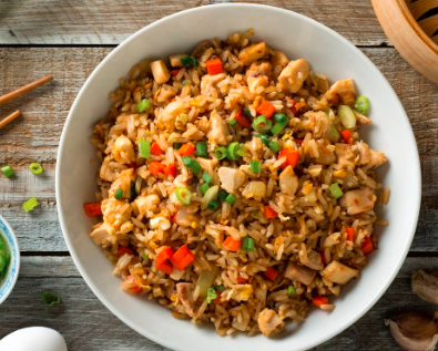 arroz frito con verduras y trocitos de pollo, topping de tampico, queso crema y aguacate