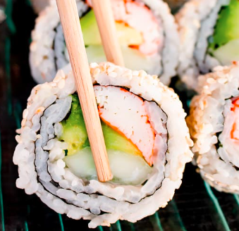 surimi, queso crema y cebollin por dentro, forrado de aguacate y bañado en salsa anguila