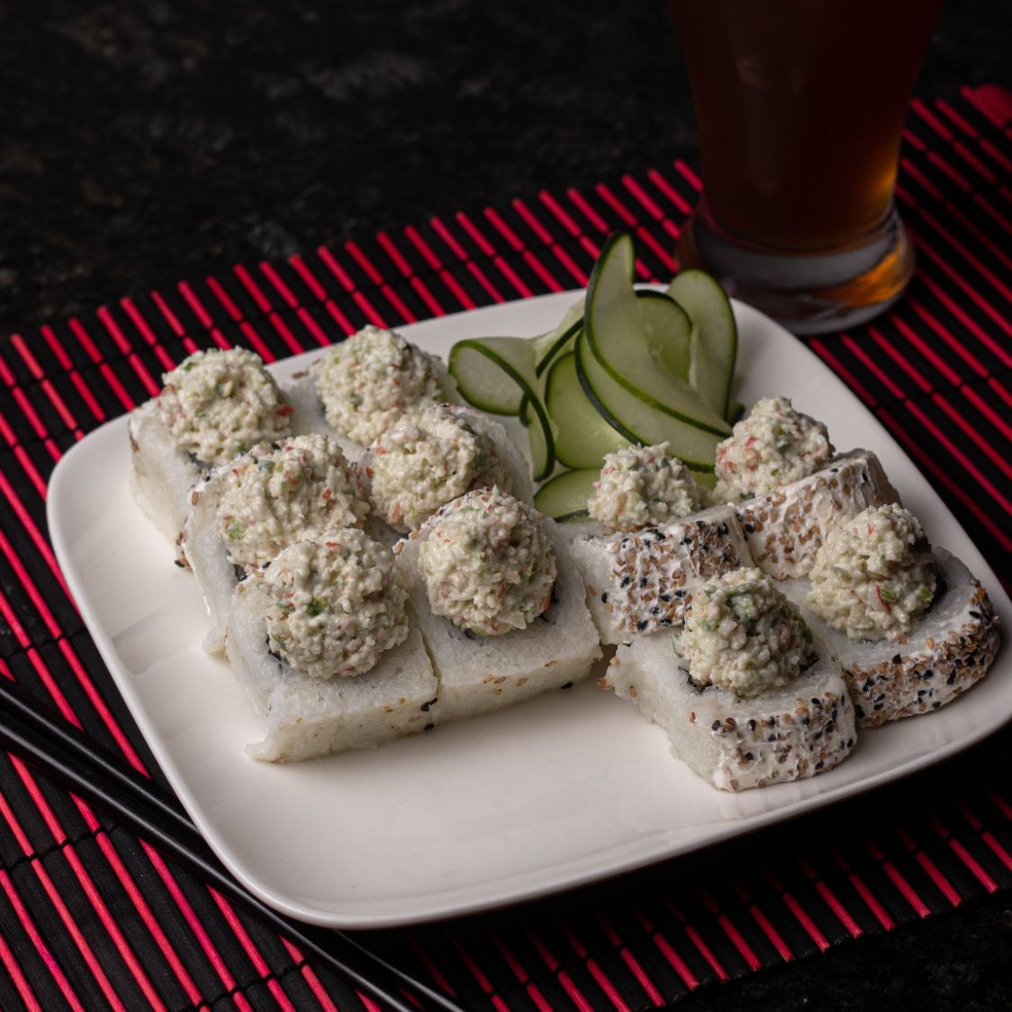 Camaron, surimi, queso crema, aguacate y pepino por dentro, topping de tampico