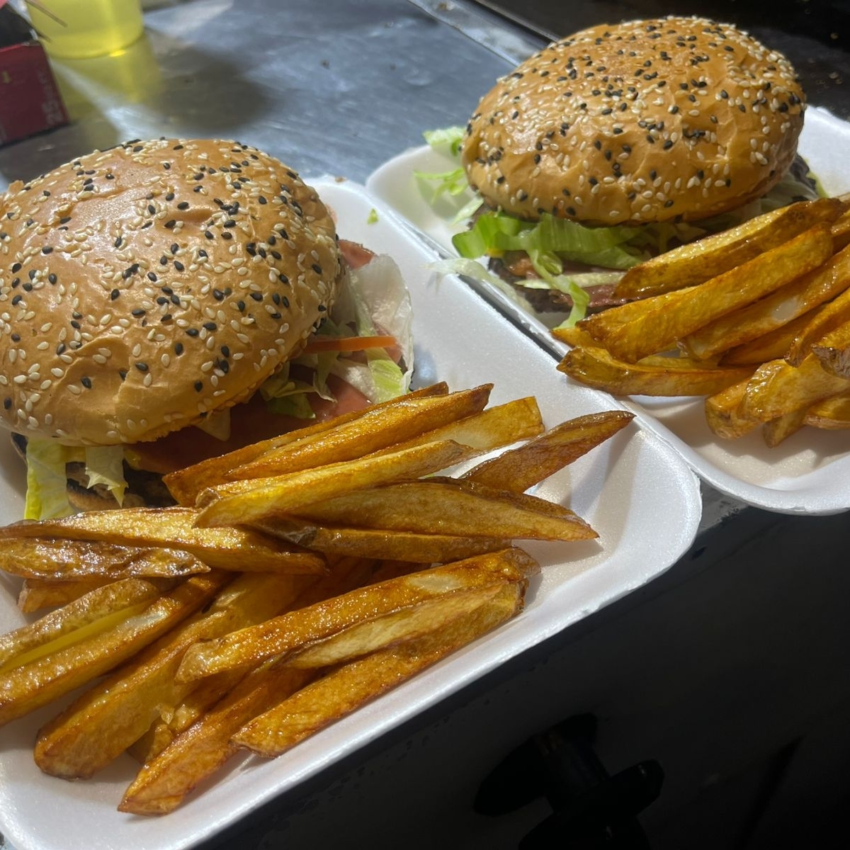 deliciosa carne 100% de res, queso amarillo, lechuga, tomate y cebolla. mayonesa, catsup y mostaza. acompañada de papas fritas