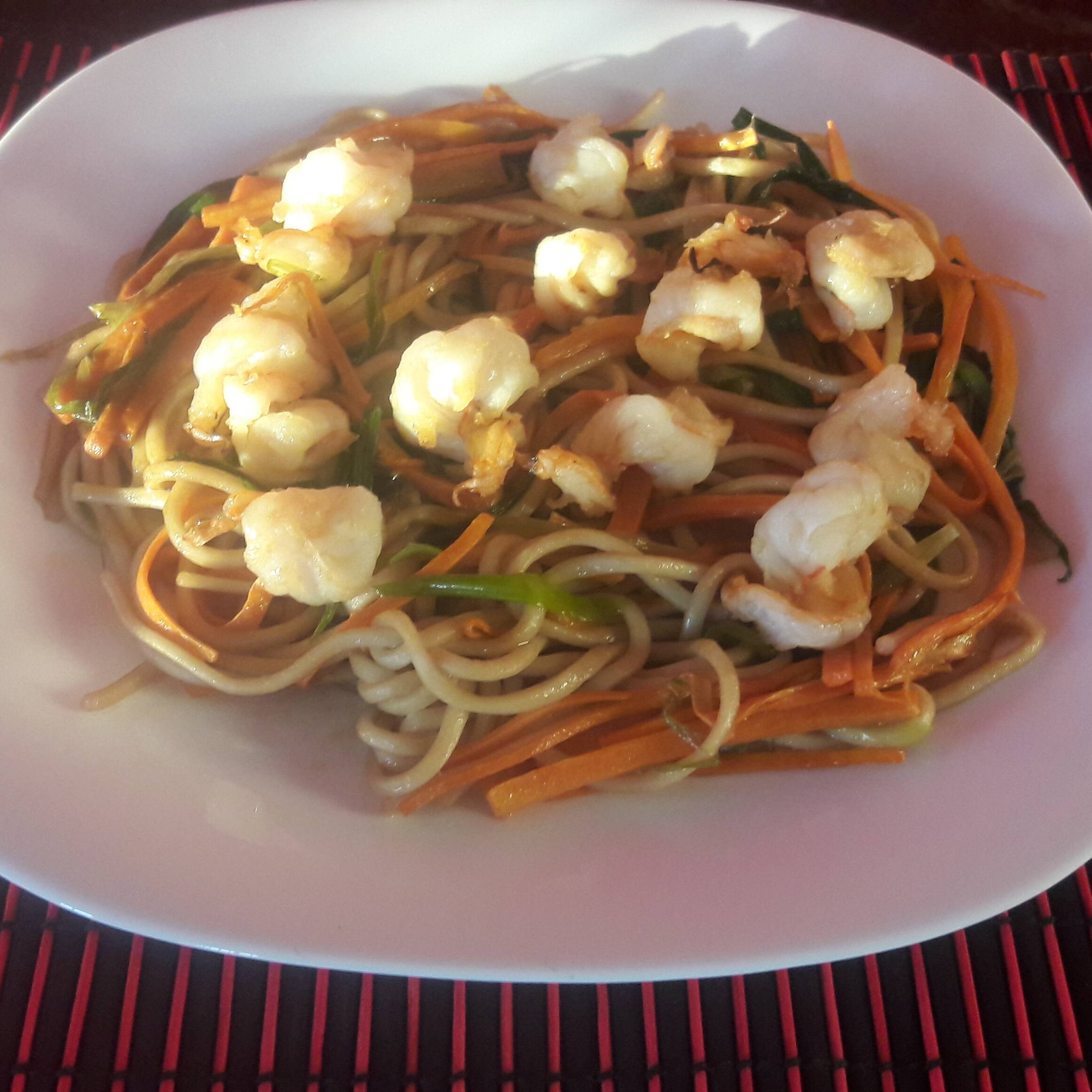 pasta con cebollin, zanahoria y calabacita, sazonada con salsa de ostión y proteína a elegir