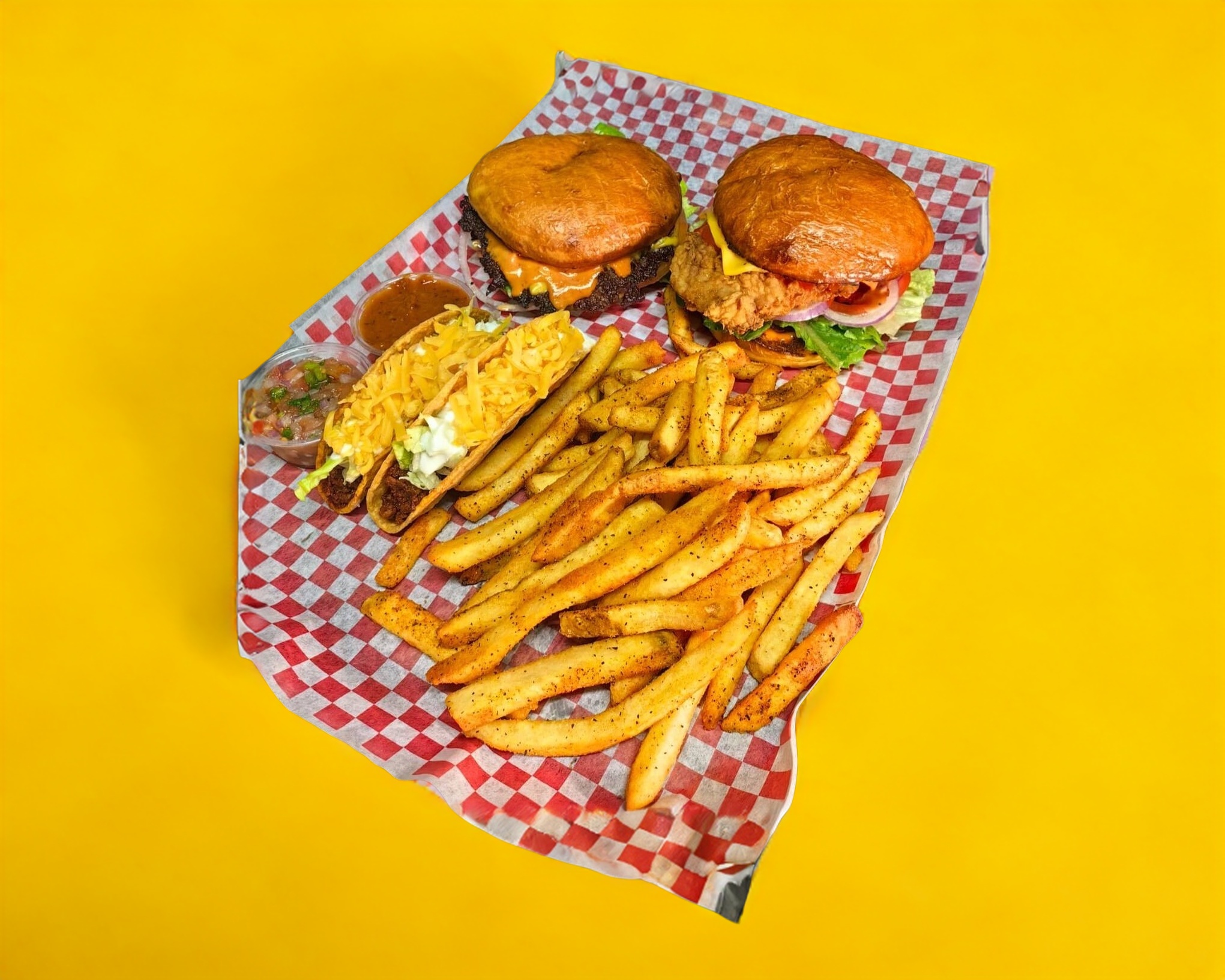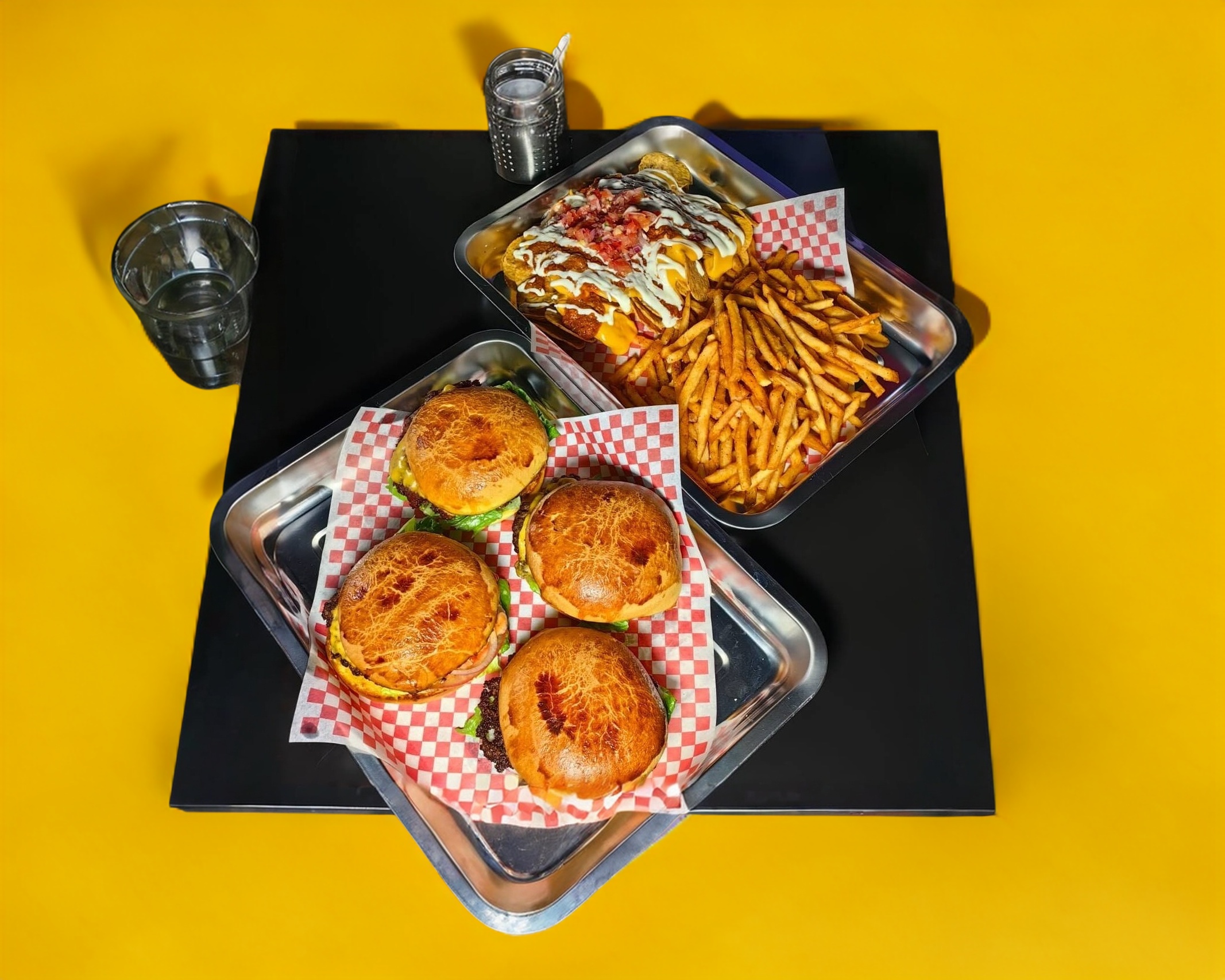 Carne molida de res 80-20 al estilo smash, queso cheddar, queso americano, queso monterrey jack, tocino, aderezo de la casa en pan brioche y acompañado de papas fritas sazonadas con rub de la casa