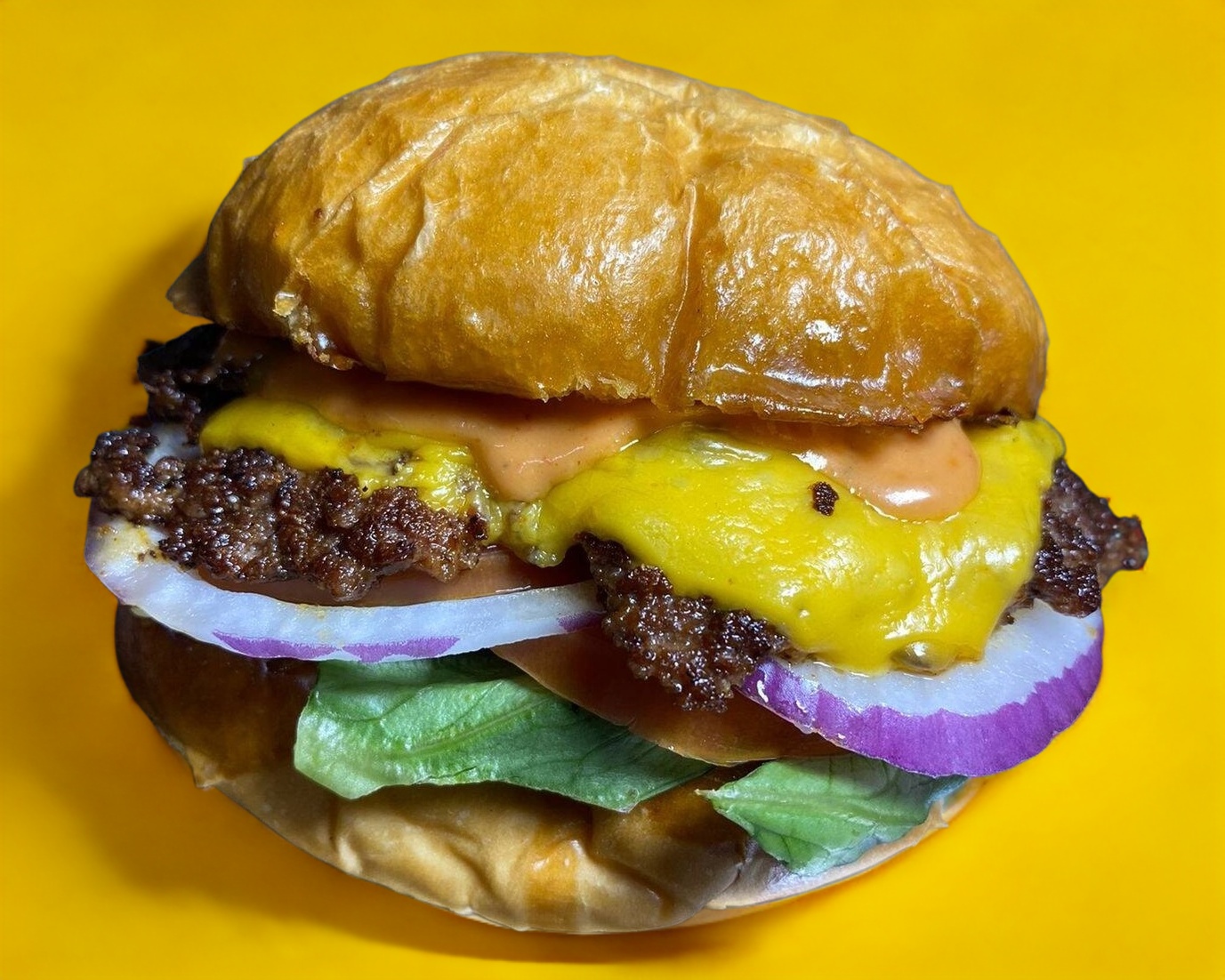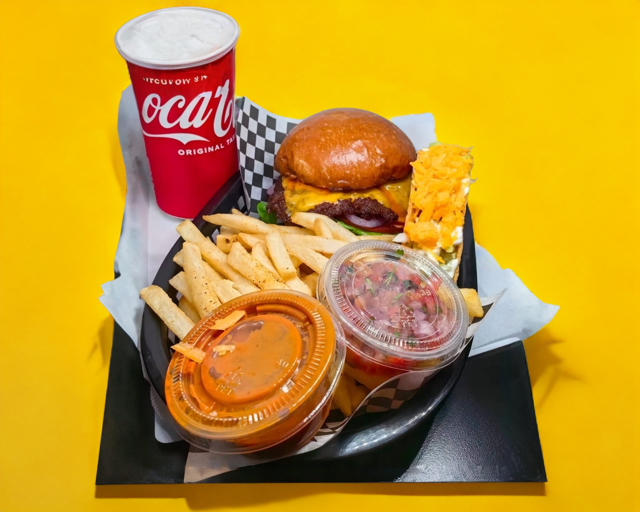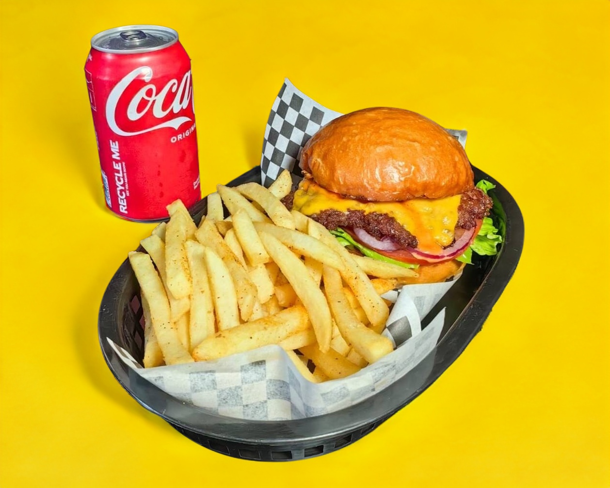 Carne molida de res 80-20 al estilo smash, queso americano, aderezo de la casa, lechuga, tomate, cebolla morada en pan brioche y acompañada de papas fritas sazonadas con rub de la casa