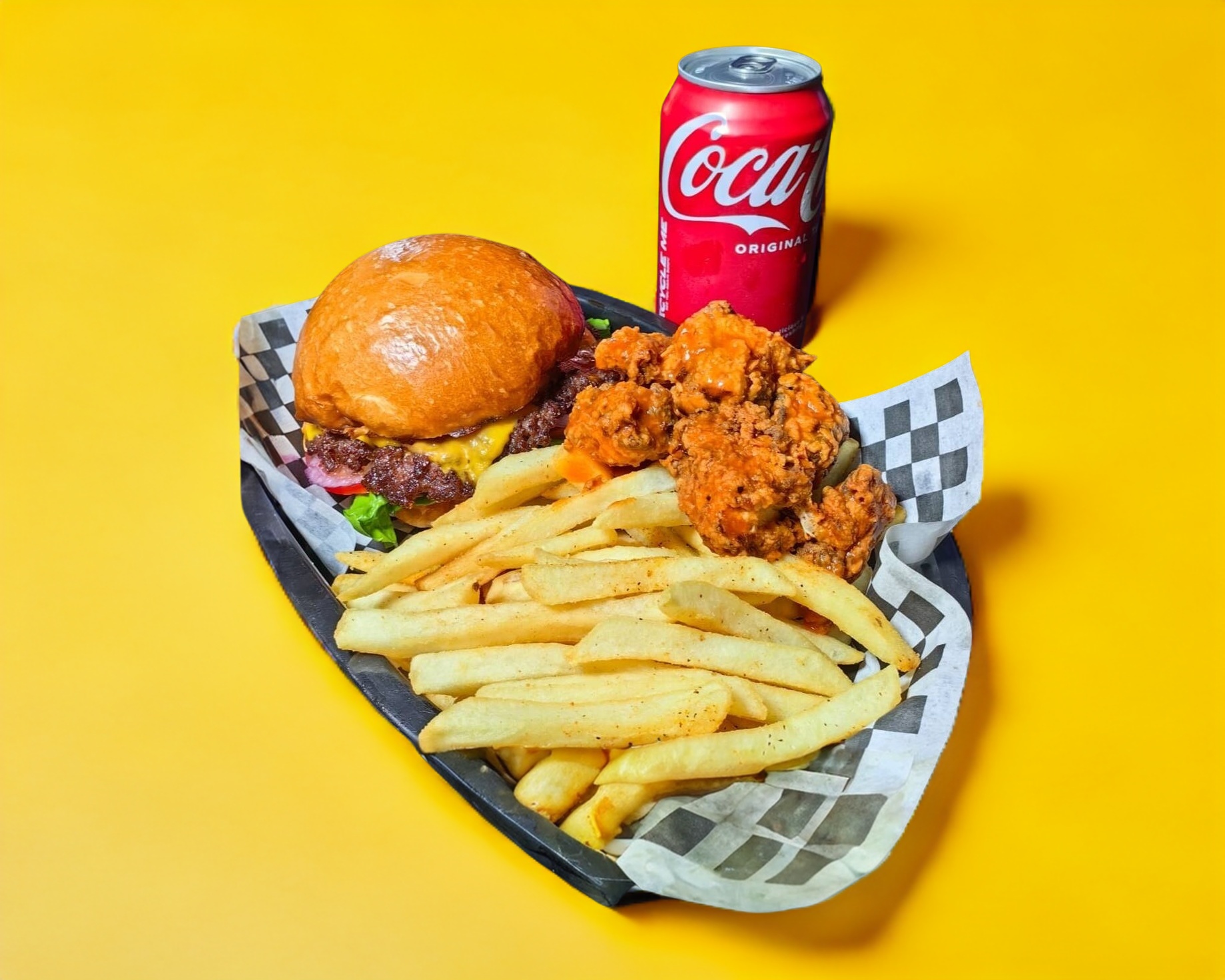 Smash burger + Papas fritas sazonadas + 1/2 boneless + Refresco de lata 355 ml