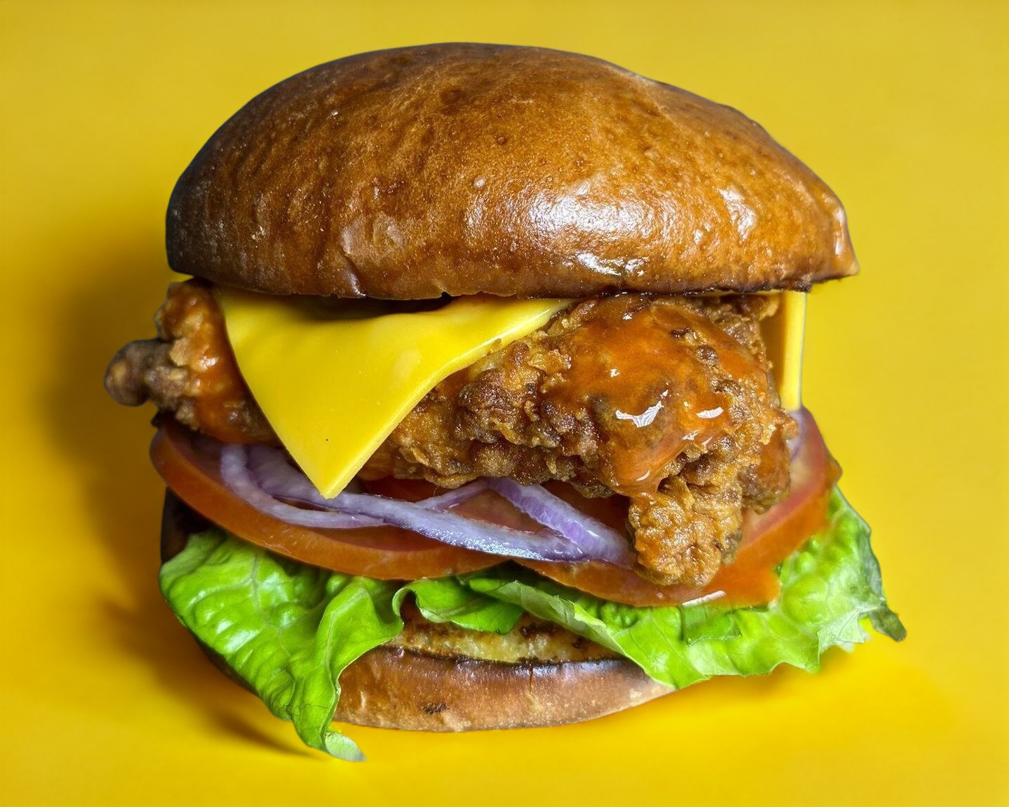 Pechuga de pollo empanizada, queso americano, lechuga, tomate, cebolla morada, un toque de salsa búfalo en pan brioche y acompañada de papas fritas. sazonadas con rub de la casa
