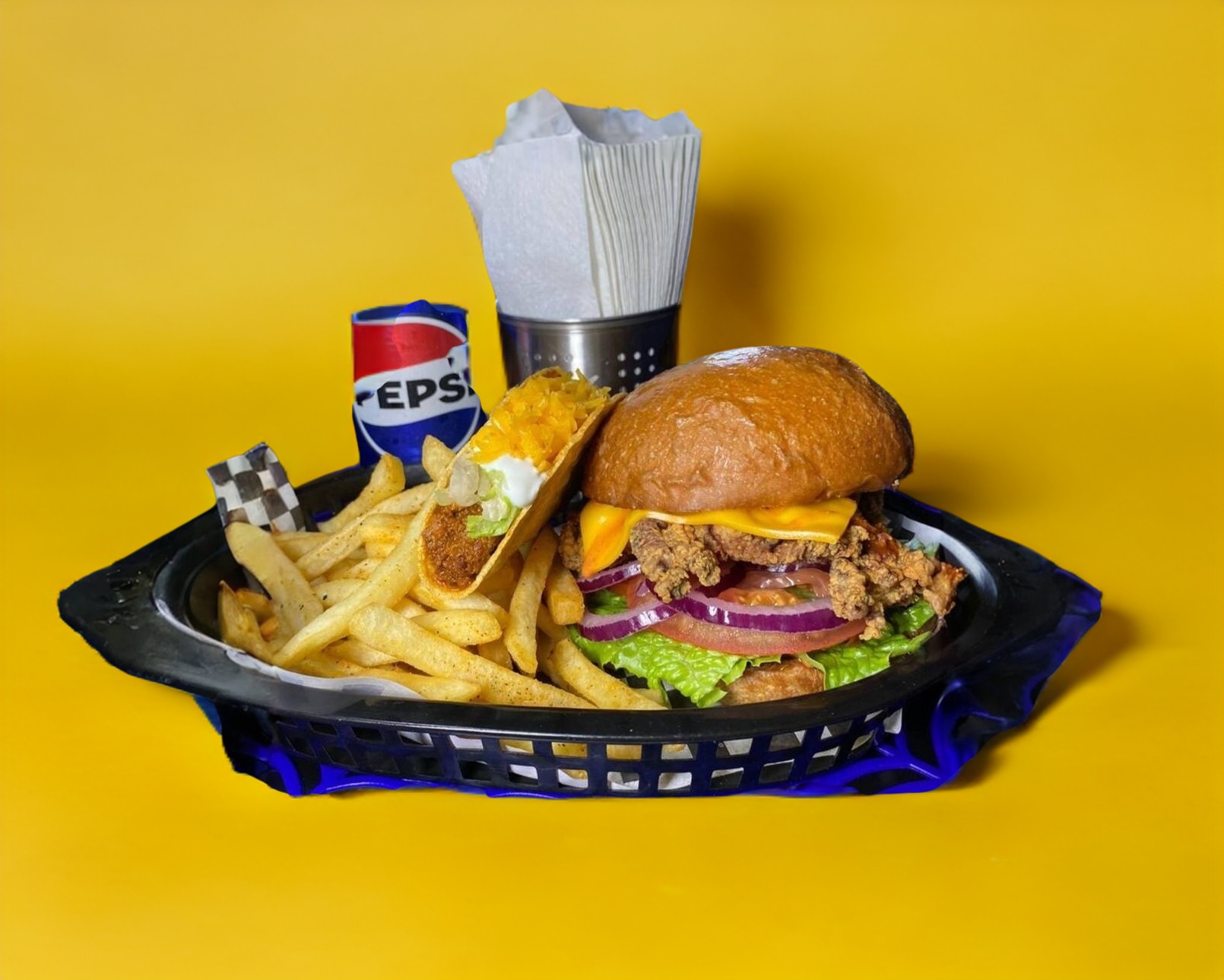 Smash burger + papas fritas sazonadas + Taquito Mb + Refresco de lata 355 ml