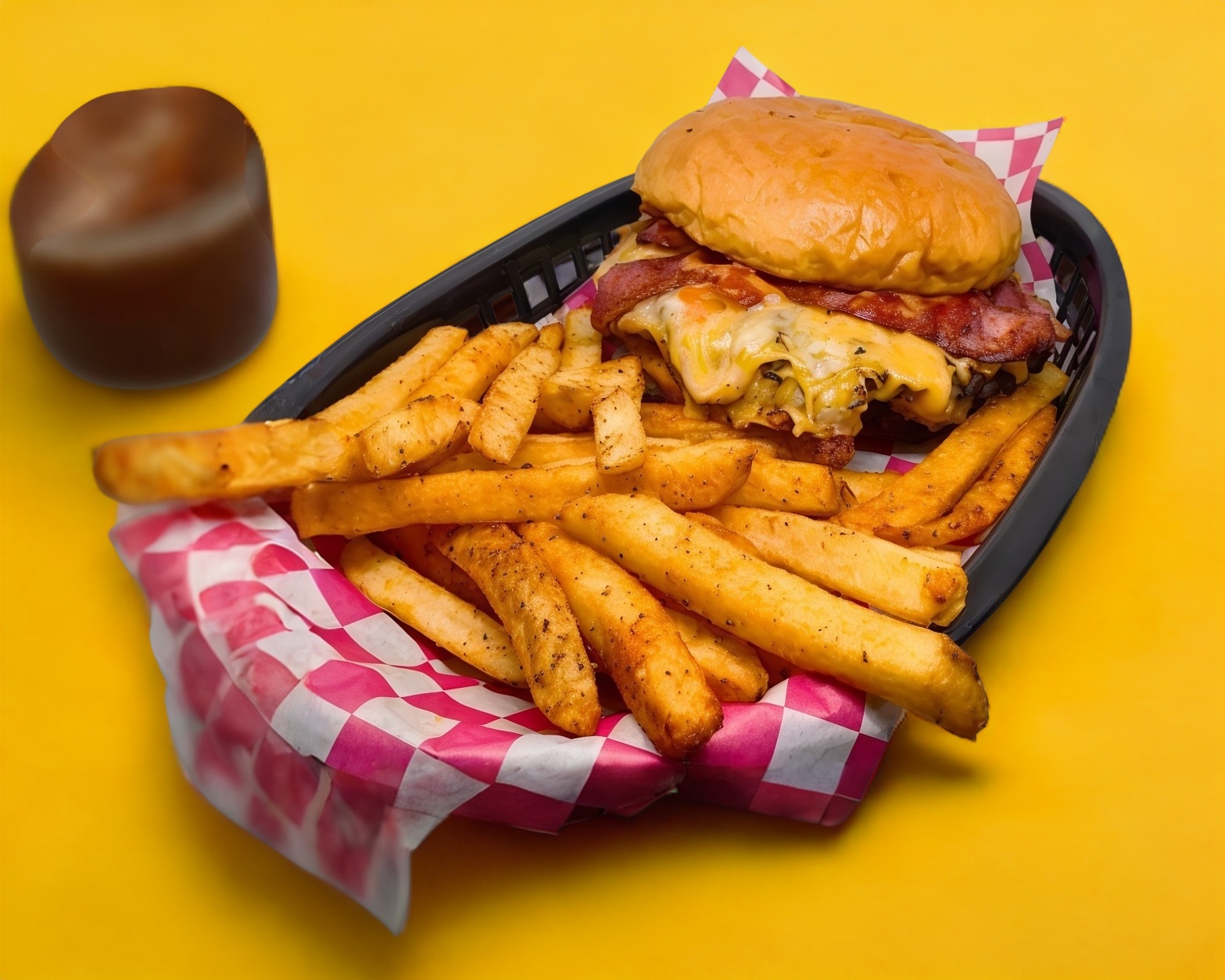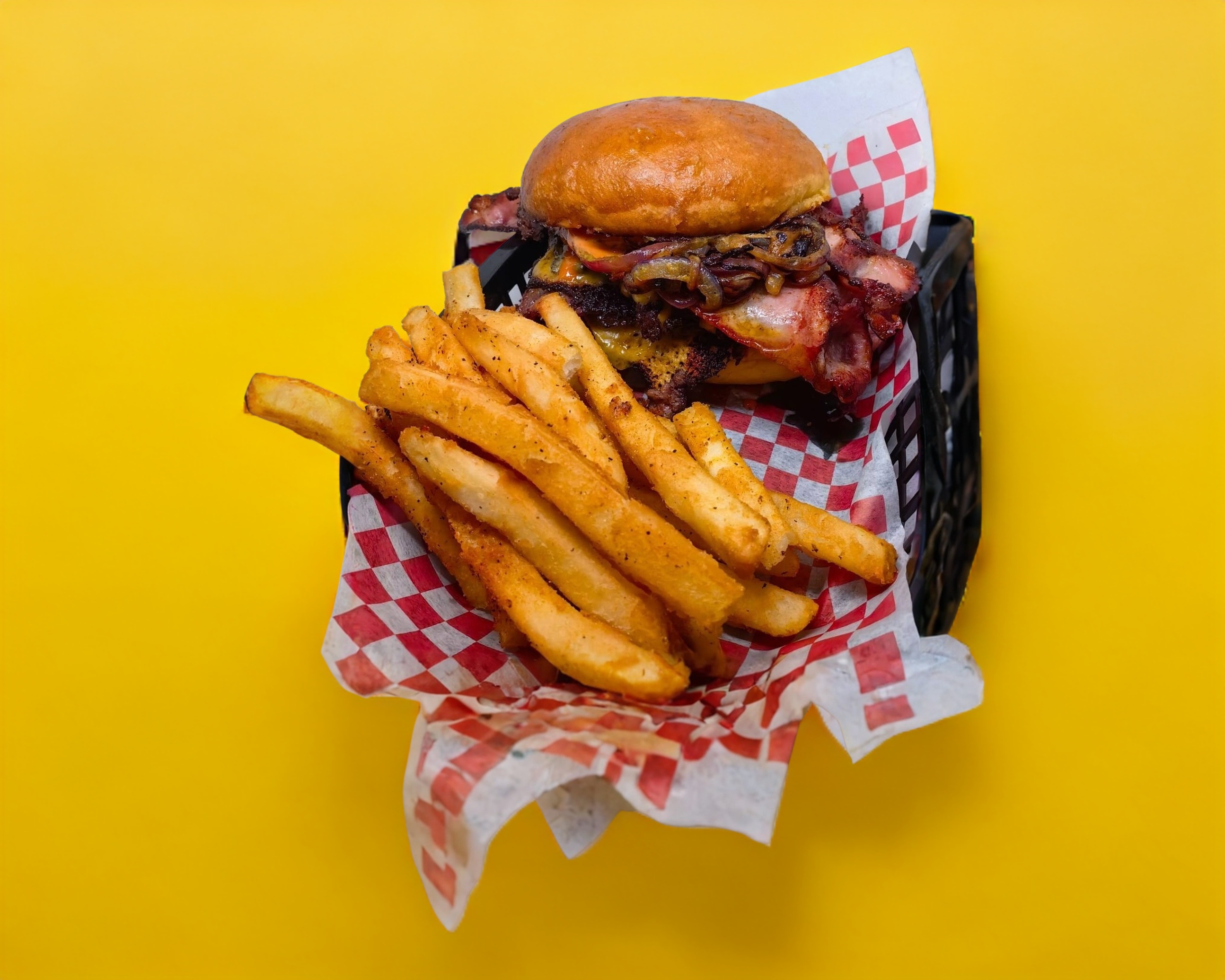 Doble carne de res 80/20 al estilo smash, doble queso suizo, mermelada de tocino, pepinillos, aderezo de la casa en pan brioche y acompañada de papas fritas sazonadas con rub de la casa.