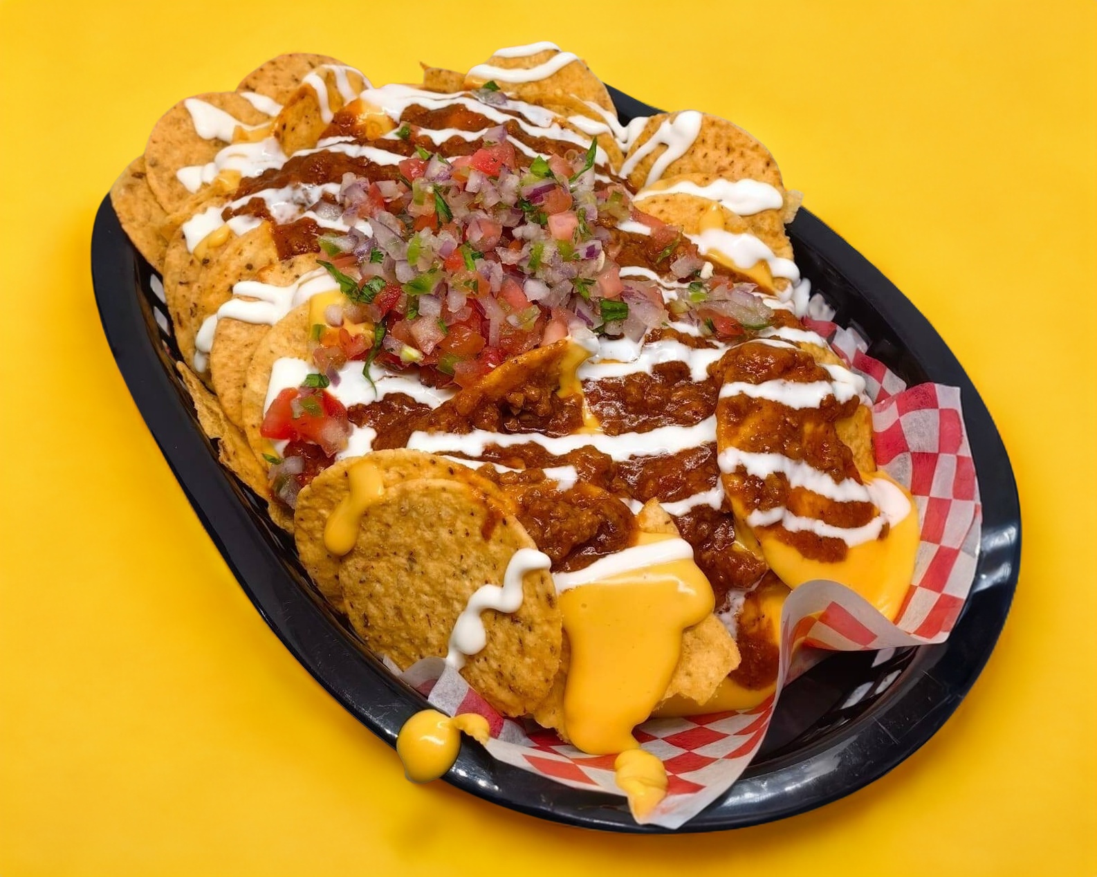 Totopos de maíz, bañados en salsa de queso cheddar, chili-meat, salsa bandera y crema agria.