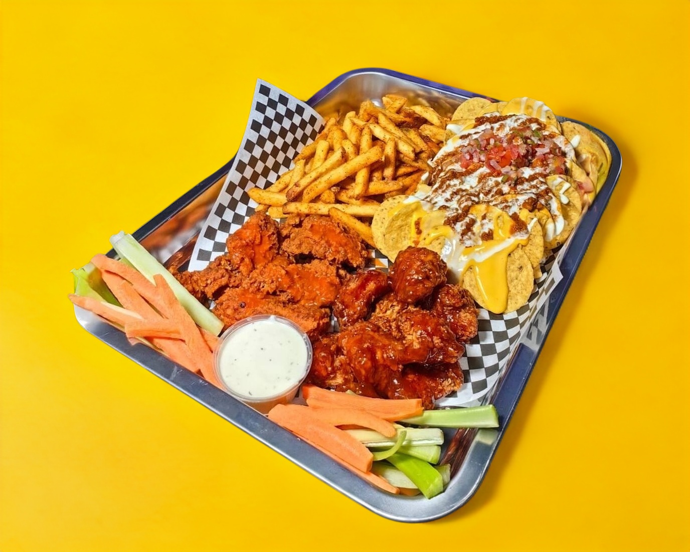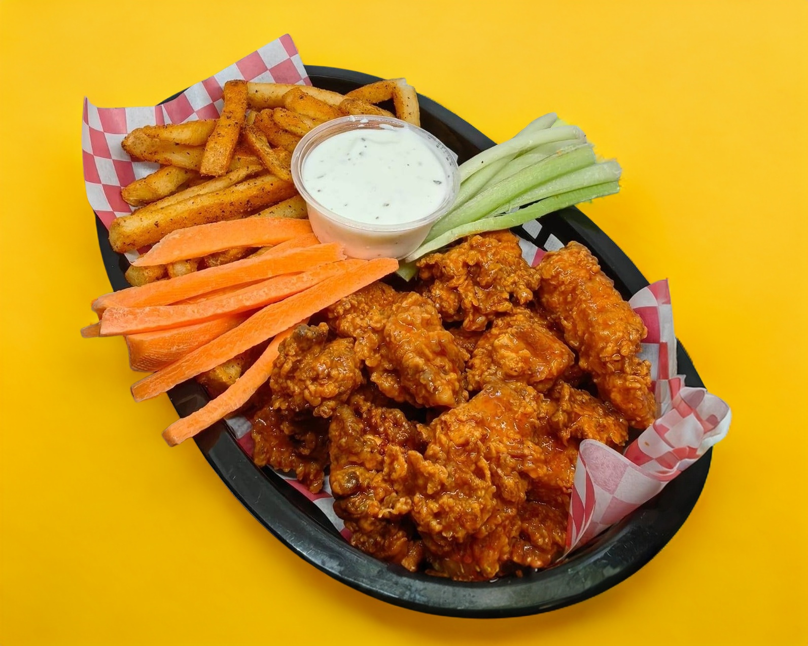 250 gramos de pechuga de pollo empanizada, bañada en la salsa de tu preferencia, aderezo ranch, bastones de apio y zanahoria, acompañados de papas fritas sazonadas con rub de la casa