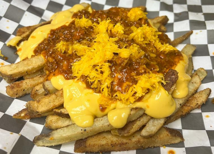 Papas fritas sazonadas con rub de la casa, bañadas en salsa de queso cheddar, chili-meat y queso cheddar rayado.