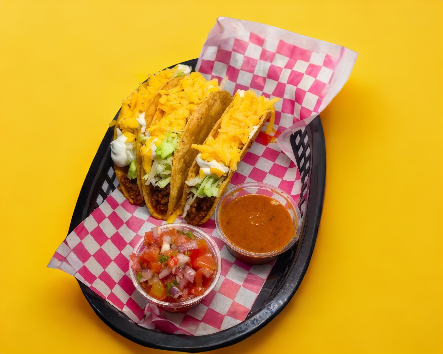 3 taquitos crujientes de carne molida de res con el sazón de la casa, salsa bandera, lechuga, queso cheddar, crema agria y salsa picante.