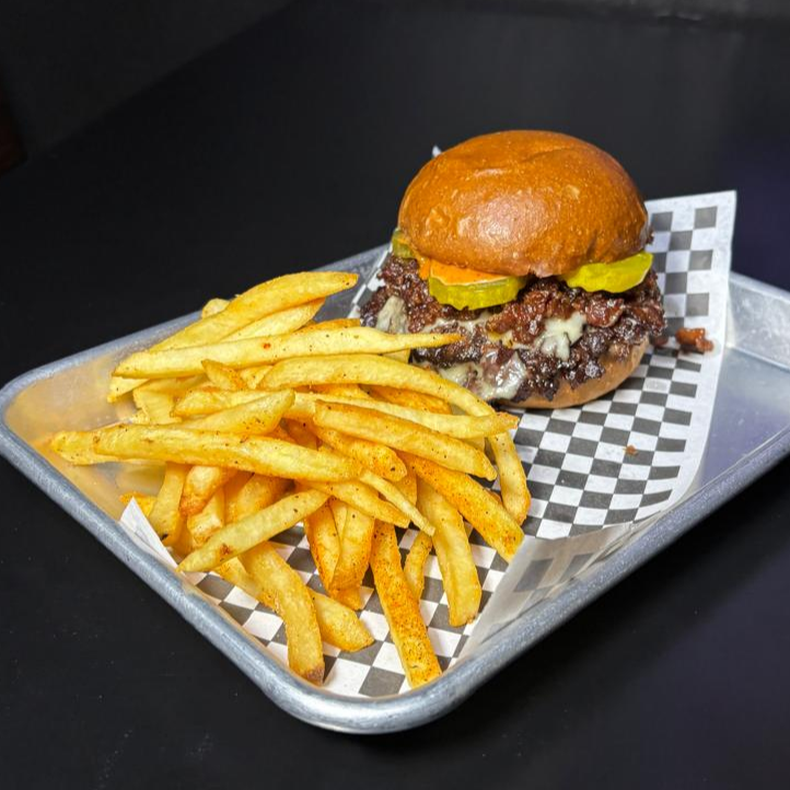 Carne molida de res 80-20 al estilo smash, queso americano, salsa de queso cheddar, chilli-meat en pan brioche y acompañada de papas fritas sazonadas con rub de la casa