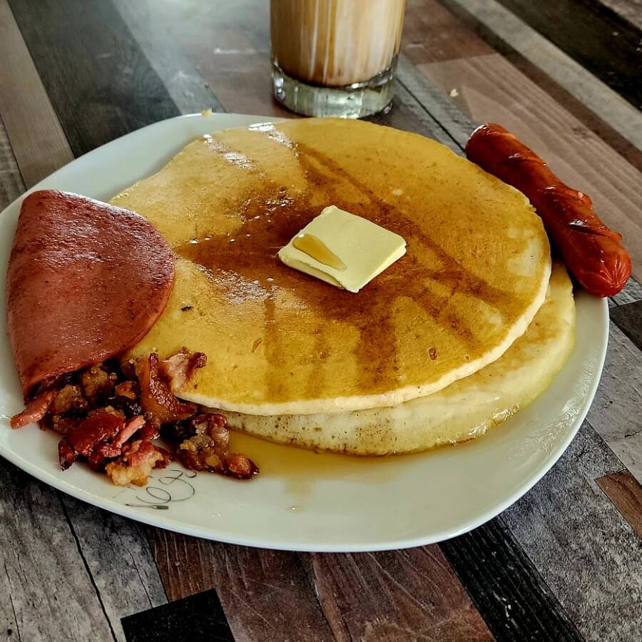 2 piezas de hotcakes de 22cm acompañado de tocino, salchicha y jamon/bolgnia , cafe americano de 10oz GRATIS