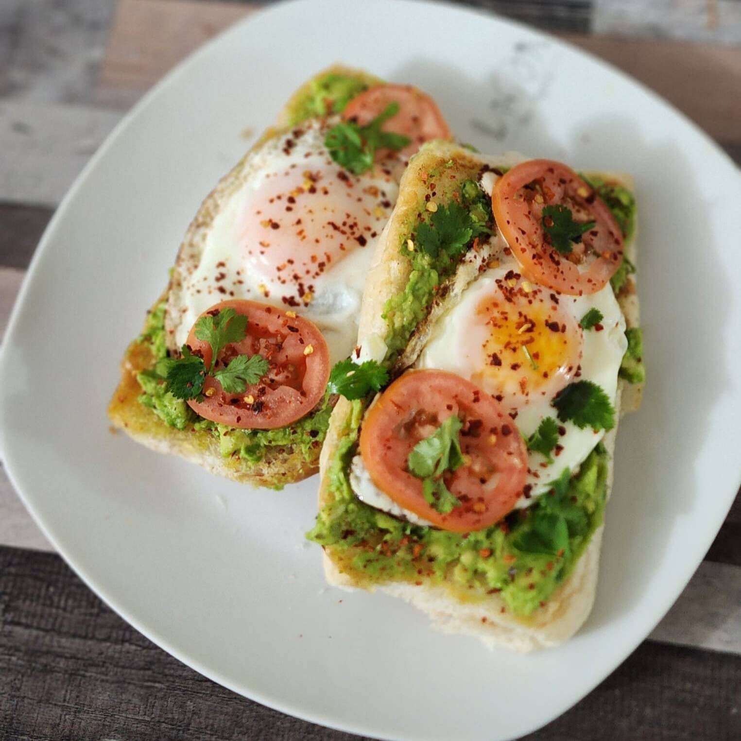 Delicioso mollete con una cama de guacamole recién hecho, huevo al gusto, jitomate y chile quebrado